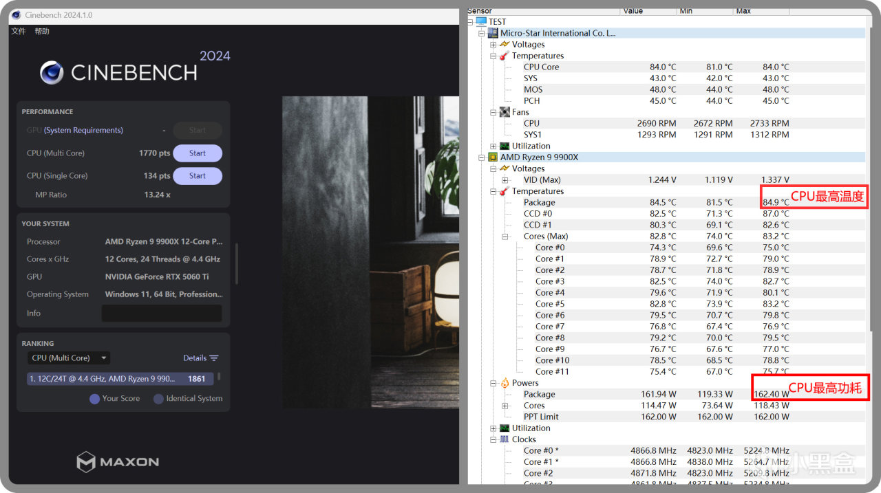 ▼首先來看下9900X的默認狀態。先使用CPU負載較重的渲染測試CineBench R24(10分鐘)進行測試,CPUID HWMonitor記錄到CPU頻率在前期會達到5.2~5.3GHz,後期會降到4.8~4.9GHz.CPU(packagae)最高溫度爲84.9°C,實際功耗爲162w。最後多核得分爲1770。
