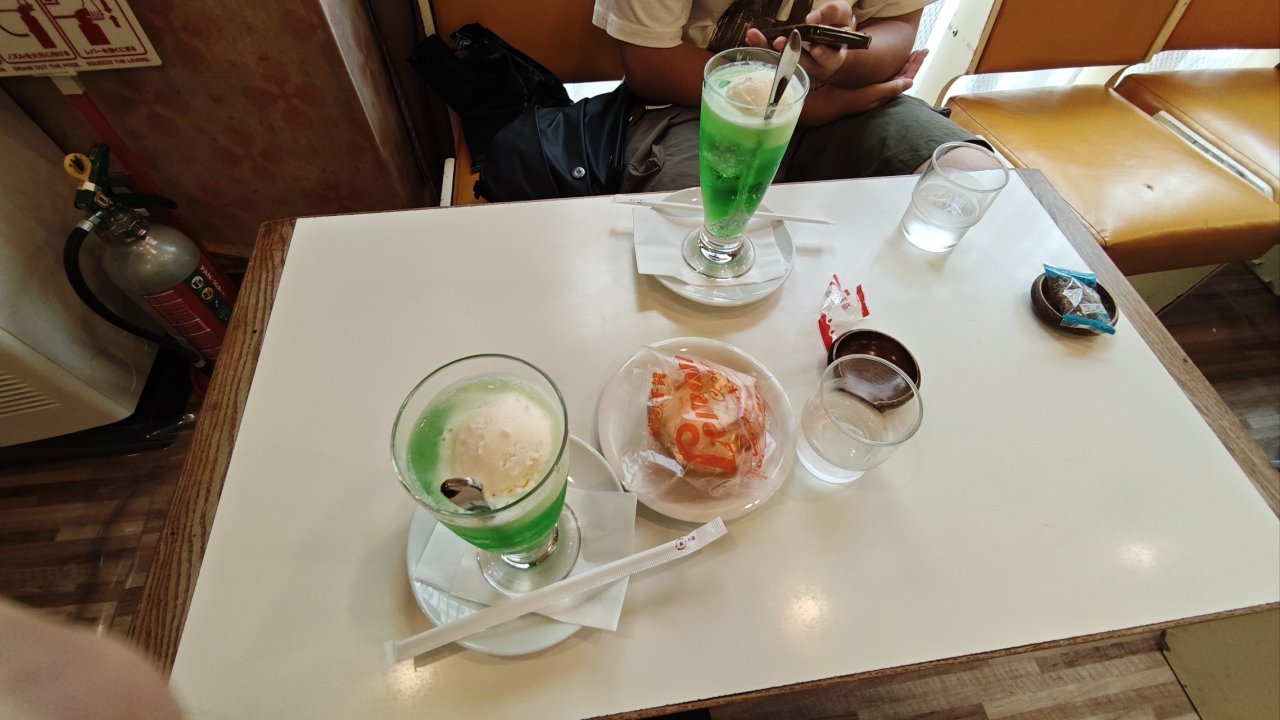 在bon千贺里吃了点东西,就当早饭了,这个绿色的汽水我喝之前一直都以为是蜜瓜味的,没想到居然是菠萝味的
