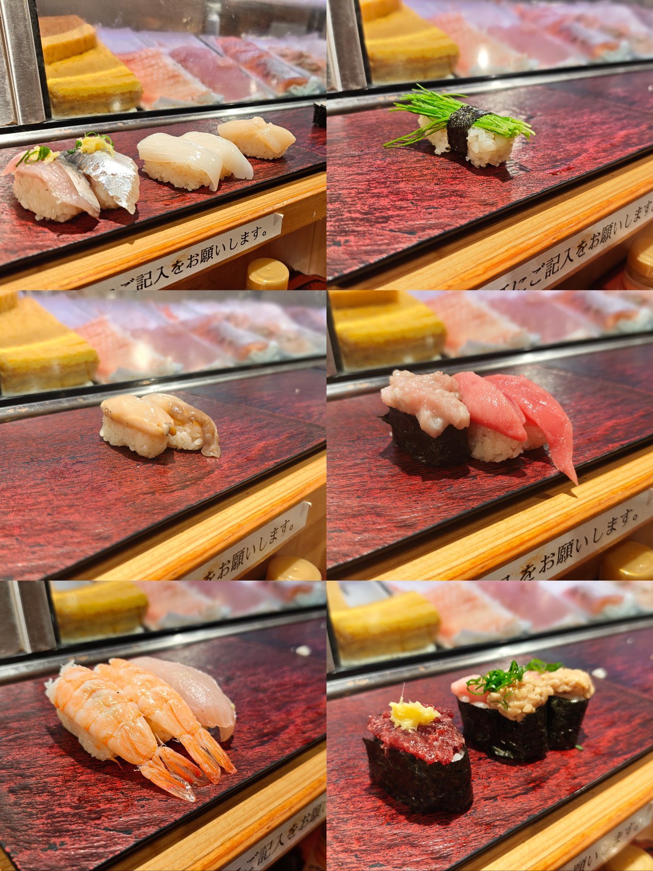 逛完之后大伙都饿了,想着我们到日本了还没吃过寿司,留学的同学就近找了家评价不错的寿司店,点餐的形式是那张纸,自己把要吃的寿司名字写下来,然后给厨师,等他给你捏,不得不说,店里鱼的种类确实比中国的日料店里的多,还有些寿司我感觉根本没在中国见过,不过这家店的虾倒是只有熟的