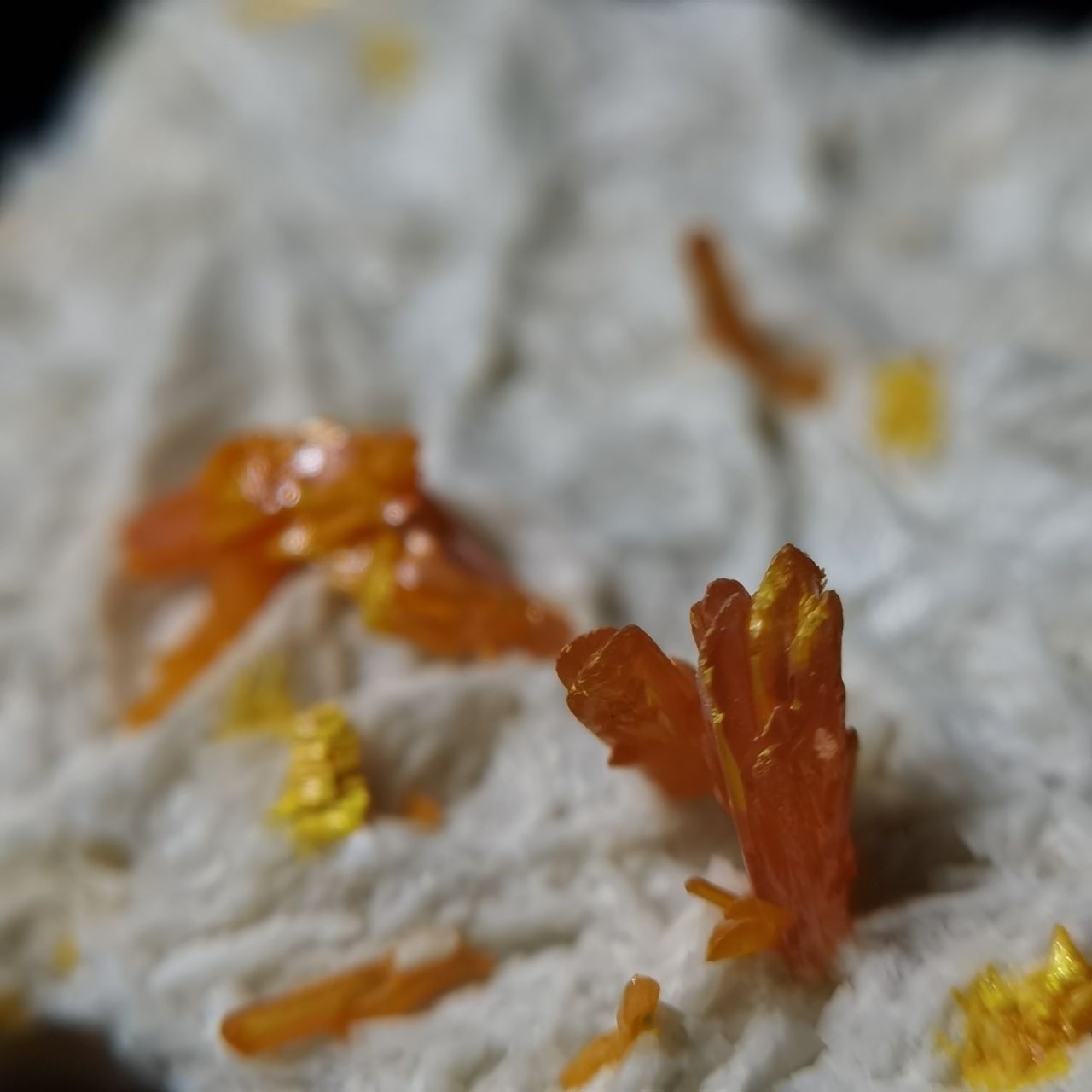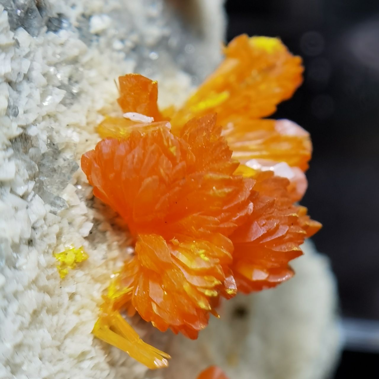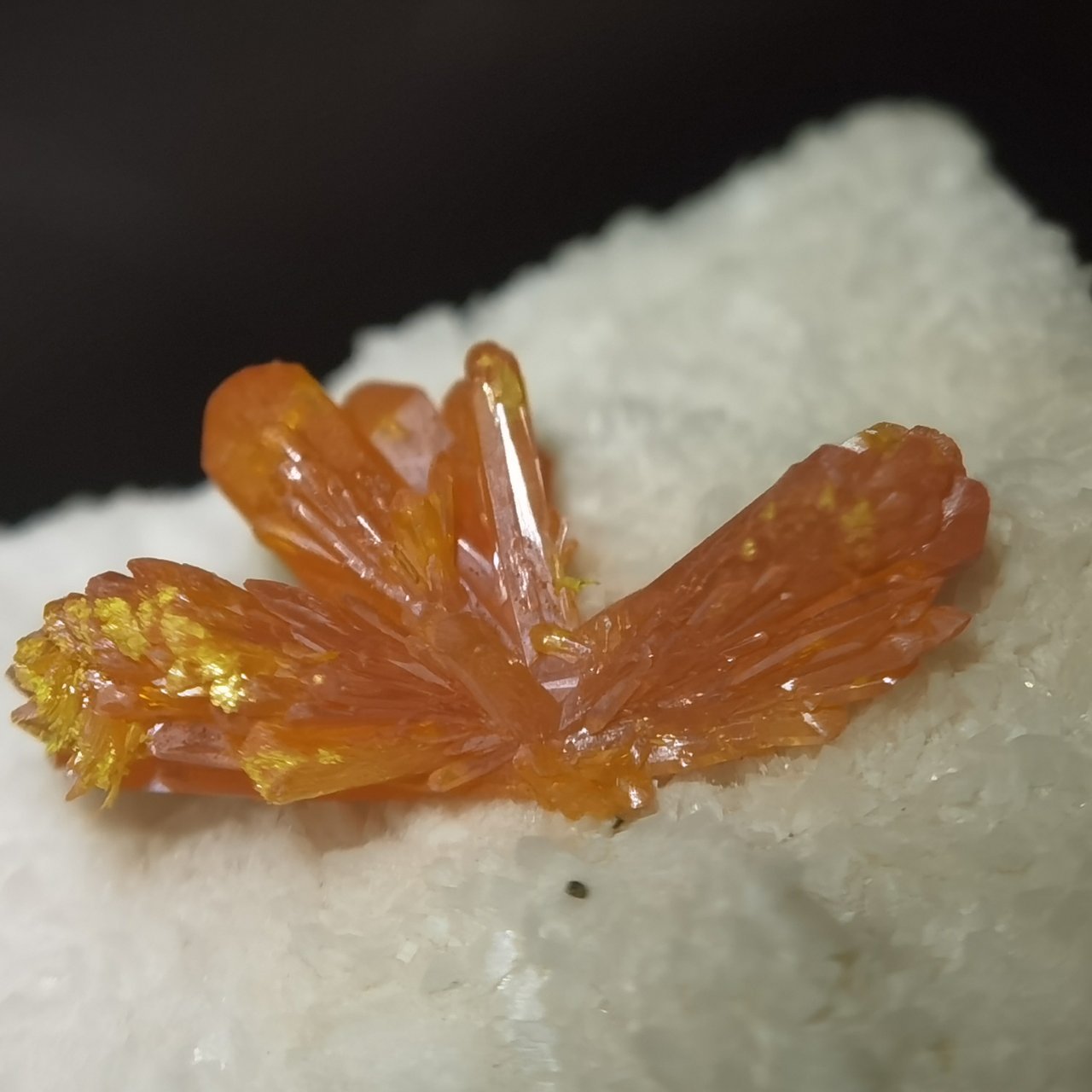 本期一共是两个标本,其中的一个大标本被我分成了四块,另一块因为其中有非常棒的夹心晶体,所以就不修了,雌黄以晶簇的形式堆集生长在花状重晶石底岩上,结晶质量巨高无比,极其美丽,可惜雌黄晶体很脆弱,产量比较小,目前也只有这么多了。