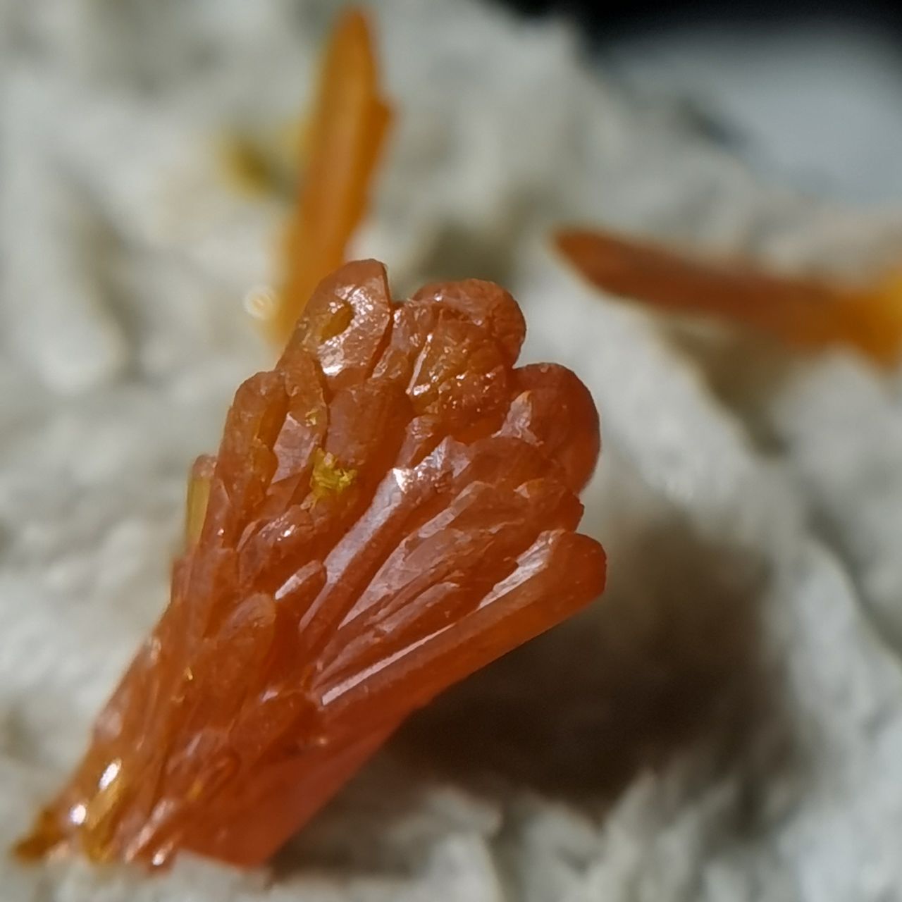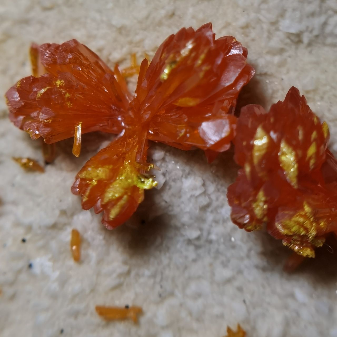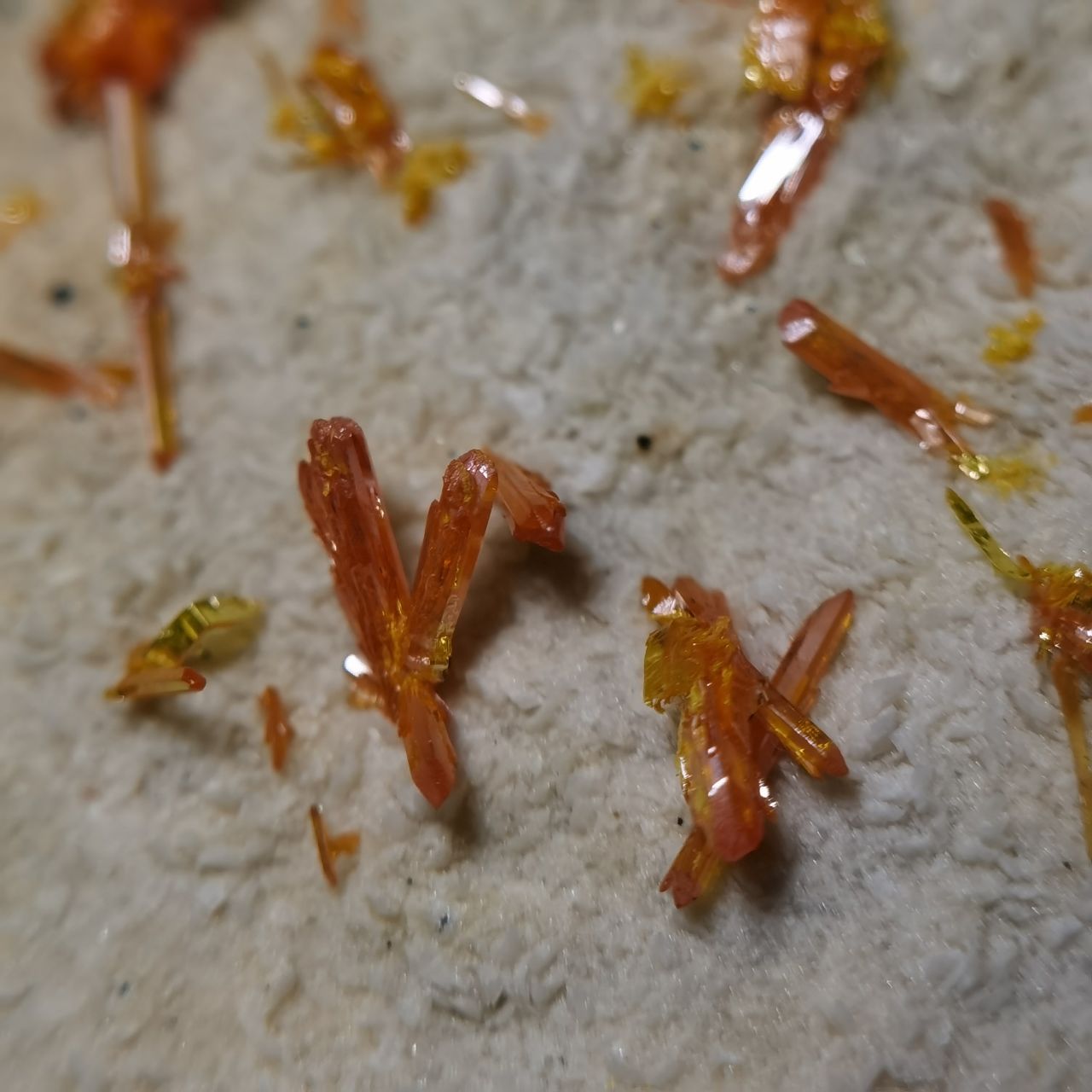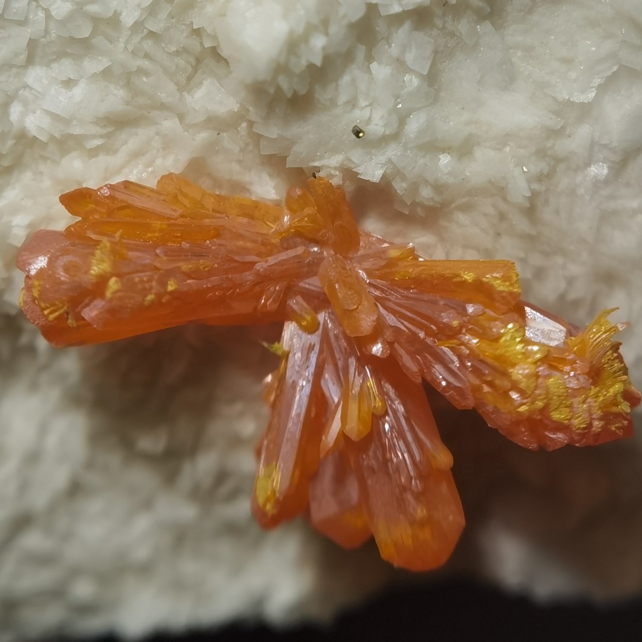 本期一共是两个标本,其中的一个大标本被我分成了四块,另一块因为其中有非常棒的夹心晶体,所以就不修了,雌黄以晶簇的形式堆集生长在花状重晶石底岩上,结晶质量巨高无比,极其美丽,可惜雌黄晶体很脆弱,产量比较小,目前也只有这么多了。