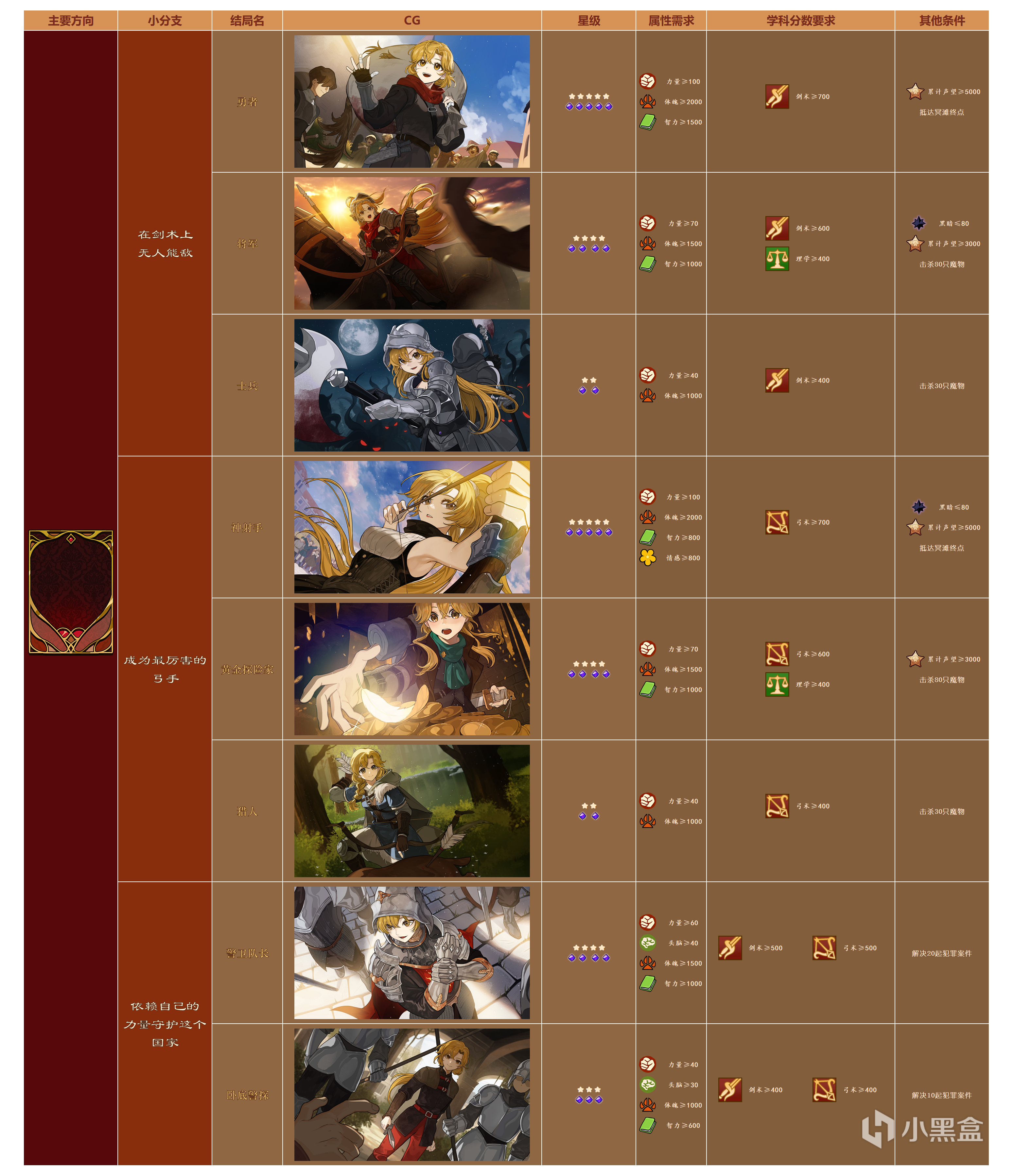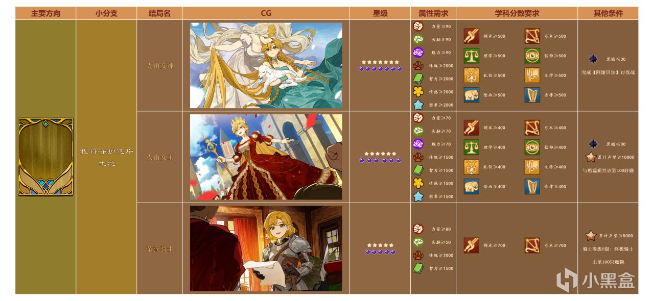 如:完成了真結局,且達成數值要求後,則“遵循君主之路”主要方向下的“我將守護這片土地”中,火山女神職業將替代火山女王和榮譽騎士,成爲選擇該分支的必定結局。