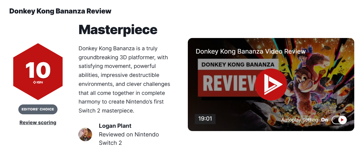 任天堂最新作品《咚奇刚:蕉力全开》全球媒体评测现已正式公开。截至发稿,游戏在Metacritic平台收录的59家媒体评分为90分,其中IGN给予满分10分评价,GameSpot则打出9分。