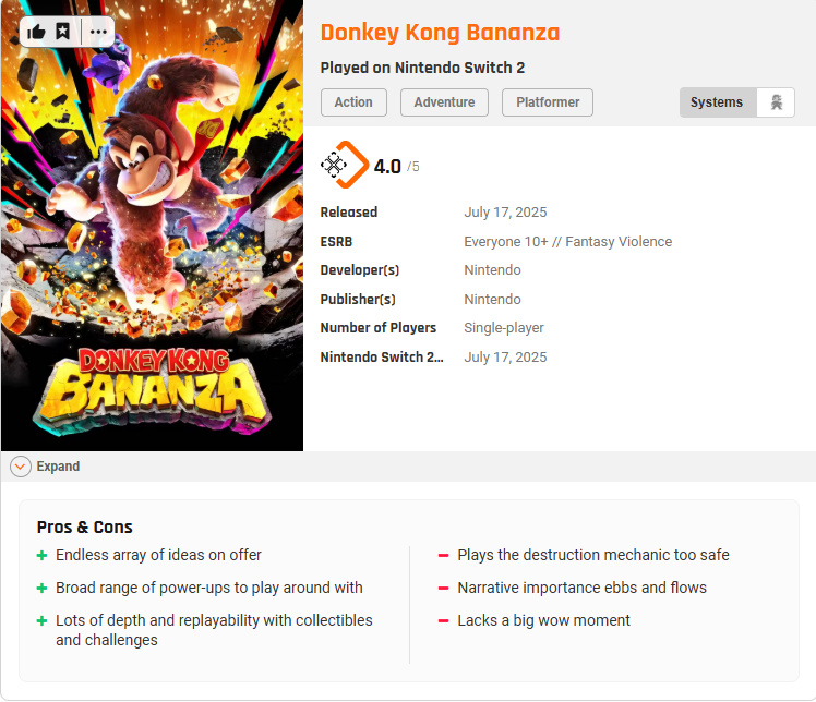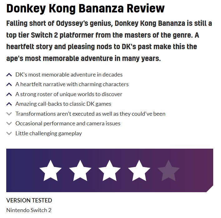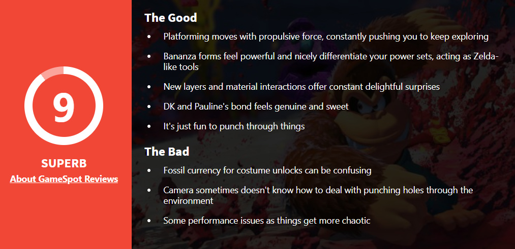 《咚奇刚:蕉力全开》将正式于7月17日发售,根据评分网站Metacritic的整理,目前有60家媒体评分,多家媒体如IGN、Washington Post、GameSpot、GamesRadar等都因为其物理引擎破坏效果、变身系统以及探索密度给予高分评价,不过VGC、TheGamer给了8分的评价,内容说到游戏难度低、BOSS战帧率存在波动、保守的设计框架等。