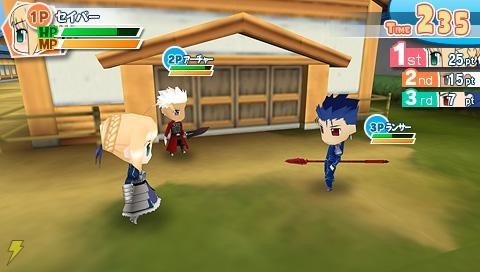 本作是一款推出在psp平台上的Q版大乱斗类游戏。游戏的故事背景仍然以冬木市的第五次圣杯战争作为基础,但是这次所要争抢的却变成了一个名为虎之圣杯的保温壶。战争的主导者也变成了在正传之中从未知晓圣杯战争存在的藤村老师。合理性不重要可爱又扯淡搞笑就对了。