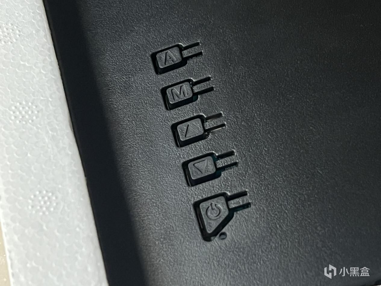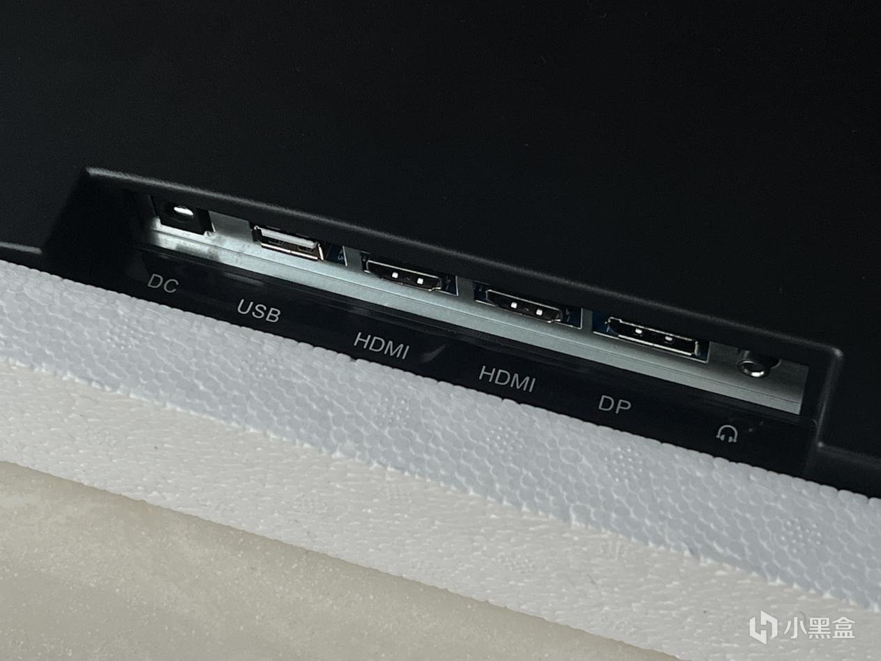 屏幕背面设置了五个按键,用来调整刚才说过的显示器参数,接口方面一个电源接口、一个USB接口、两个HDMI 2.0、一个DP1.4和一个音频接口。
