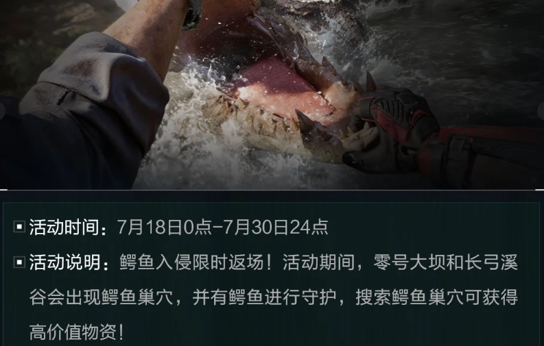 最让人兴奋的是“鳄鱼巢穴”活动回归!在长弓溪谷和零号大坝这两张地图的常规及机密模式(不包括黑夜行动)中,将会额外出现入侵的鳄鱼和鳄鱼巢穴!上次有不少干员反应摸到了半身像、坦克步战车以及化石等大红物品,爆率比大保险还高!