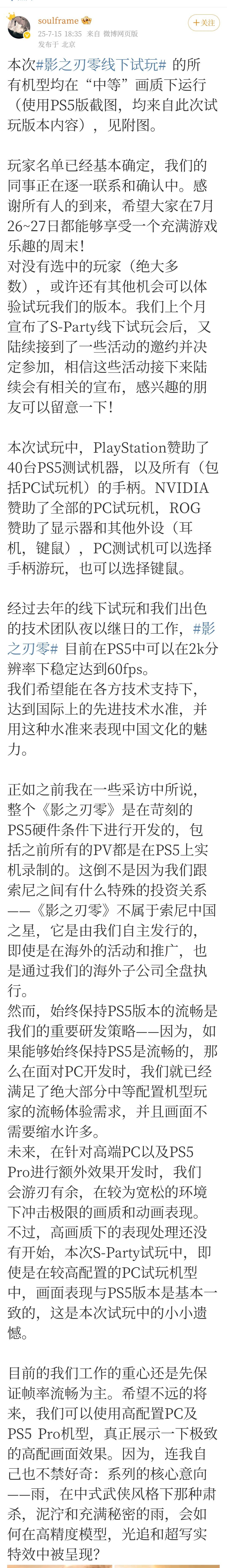 梁其偉在微博中也提到,雖然此次試玩版本仍是研發中內容,後續團隊已接到多場邀約,將在更多線下展會上繼續開放試玩。對於未能入選本次體驗的玩家,還將陸續有機會深入感受《影之刃零》的獨特世界。