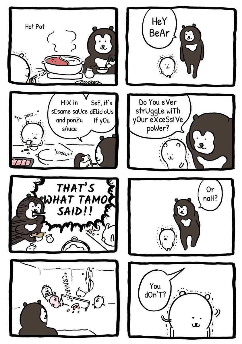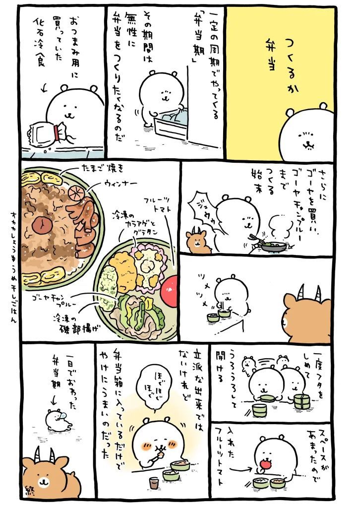 所以早期的自嘲熊,都是出現在一些推特上,長野描繪自己日常的小漫畫中。而且通常都是記錄它(她)喫到了什麼美食,對食物的評價又如何。