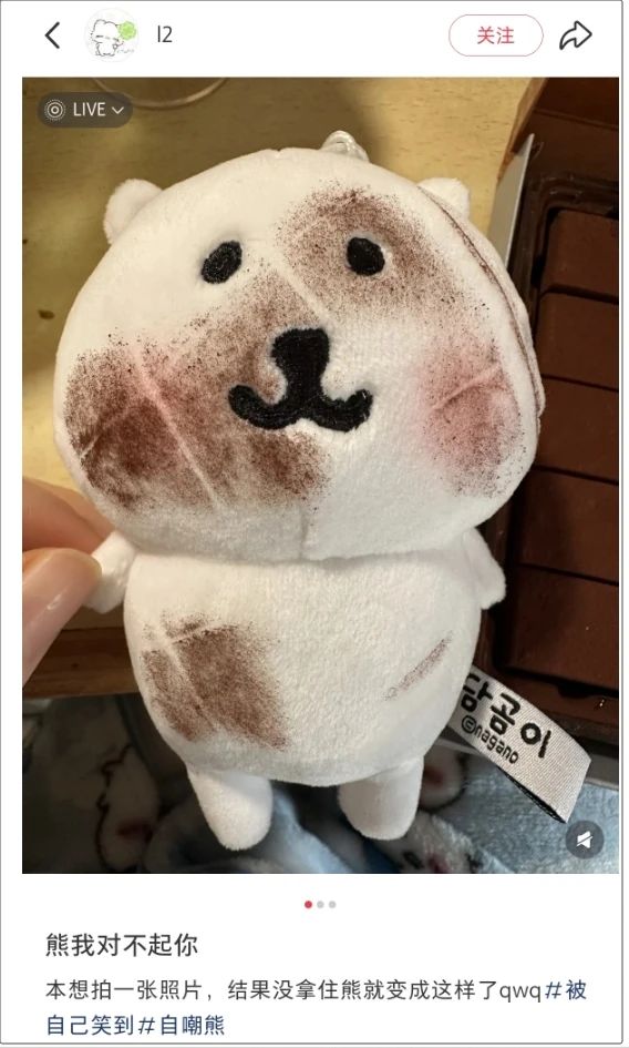 於是,越來越多的年輕人開始帶上自己喜歡角色的玩偶,讓它們變成照片的主角,這樣就能名正言順地拍照留念了。而自嘲熊,就是這類照片中,最常見的主角之一。