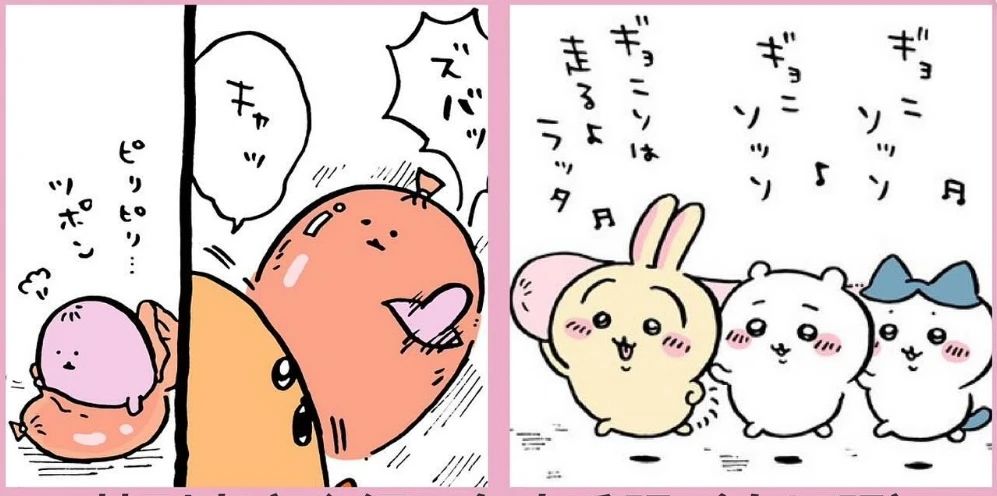 而且,這些漫畫也像Chiikawa的漫畫一樣,有時帶着一些長野特有的黑色幽默,並且會互相聯動。比如Chiikawa漫畫的有一集裏,它們找到了某種巨大的魚肉腸,並開始食用,而這些魚肉腸,實際上是自嘲熊漫畫裏的角色。