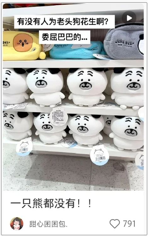 說自嘲熊低調,其實只是和火到燙的Chiikawa相比。在小紅書這種平臺上,你每天都能刷到很多數千點讚的自嘲熊貼,所以它在特定羣體裏,熱度是非常高的。商家也開始抓取這波熱度,像是名創優品,最近就聯動了自嘲熊的周邊——雖然你去了後,經常會發現哪兒都找不到熊,倒是看到一堆漫畫裏的其他角色。