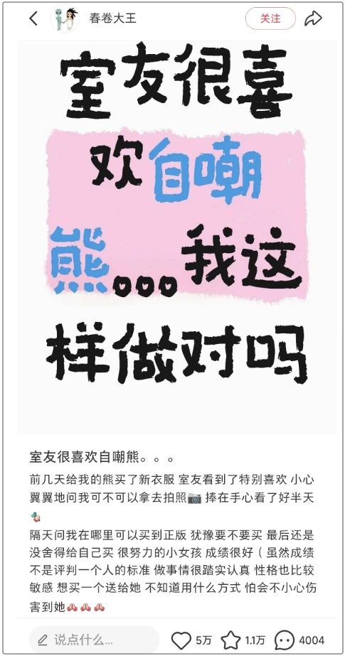 在小紅書上,有個五萬點讚的帖子,大致是說有人見室友很喜歡自己的自嘲熊,但猶豫再三,最終也沒捨得買一個,便想送她一個玩偶,但不知這樣是否會傷到室友的自尊,便向網友求助。