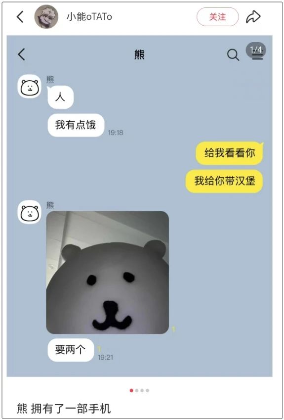 粉絲口中的玩偶自嘲熊,有奇特的斷句方式,它會用“人”來稱呼玩偶的擁有者。“熊,在想人”“人,要好好喫飯”“熊,沒有給人的文章點贊”……粉絲們還會把這種句式P成聊天記錄,模仿自嘲熊與自己的對話。