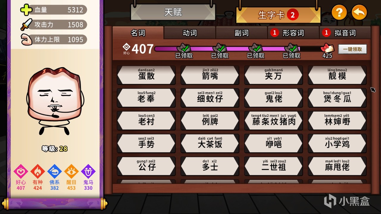抬頭一看,遊戲工作室的名字就叫做“無厘頭”,最符合名字的一集。除此之外他們是很有心想要傳播一下來自廣府一帶的文化。遊戲內置了非常多粵語的生字卡,點一下還會發對應的音,裏面還有各種詳細的註釋。本身遊戲也是有粵語配音的,這塊叉燒主角甚至是製作人本人親自上場配的。除了這些之外還有各種港片啊美食啊之類的東西一併給你放在遊戲裏做宣傳