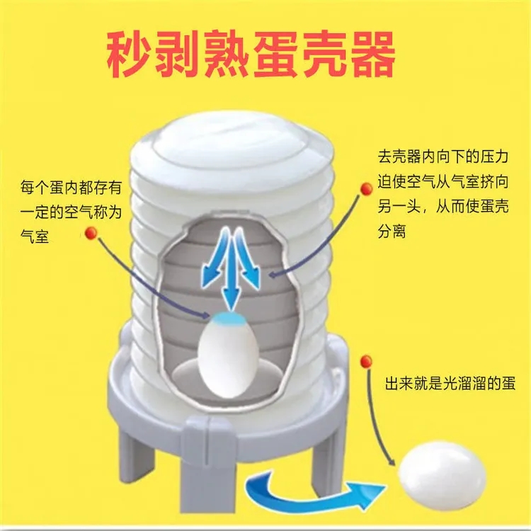 产品介绍:把煮熟的鸡蛋放在他们设计的凹槽里,然后用力一按,鸡蛋壳会被凹槽撕开剥离,本体则会掉落下去,理论很美好,但是实际上他们这玩意对鸡蛋的要求极高,大鸡蛋会被砸碎,小鸡蛋会直接溜出去,总结不如手剥。