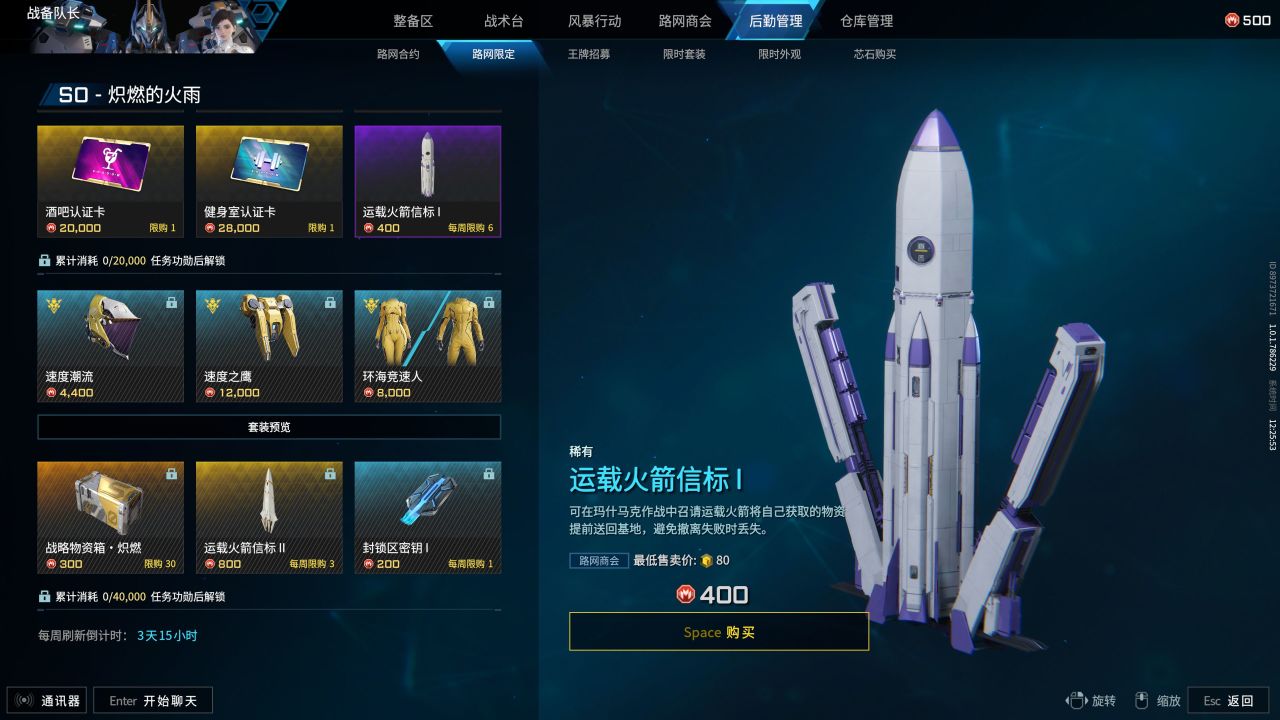 ·第二層級(需消耗20,000任務功勳解鎖)增加【運載火箭信標Ⅱ】,每週限購數量由1個提升至3個;【戰略物資箱·熾燃】【運載火箭信標Ⅱ】購買無需簽訂路網合約;