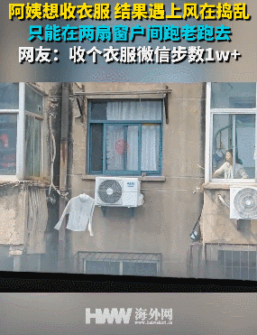 近日,江苏,网友拍到大姨收衣服时被风“戏弄”的场景,逗乐网友。