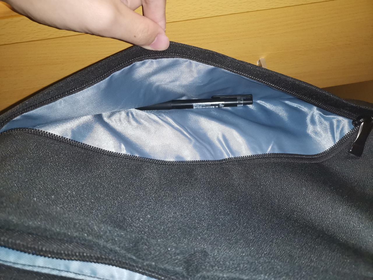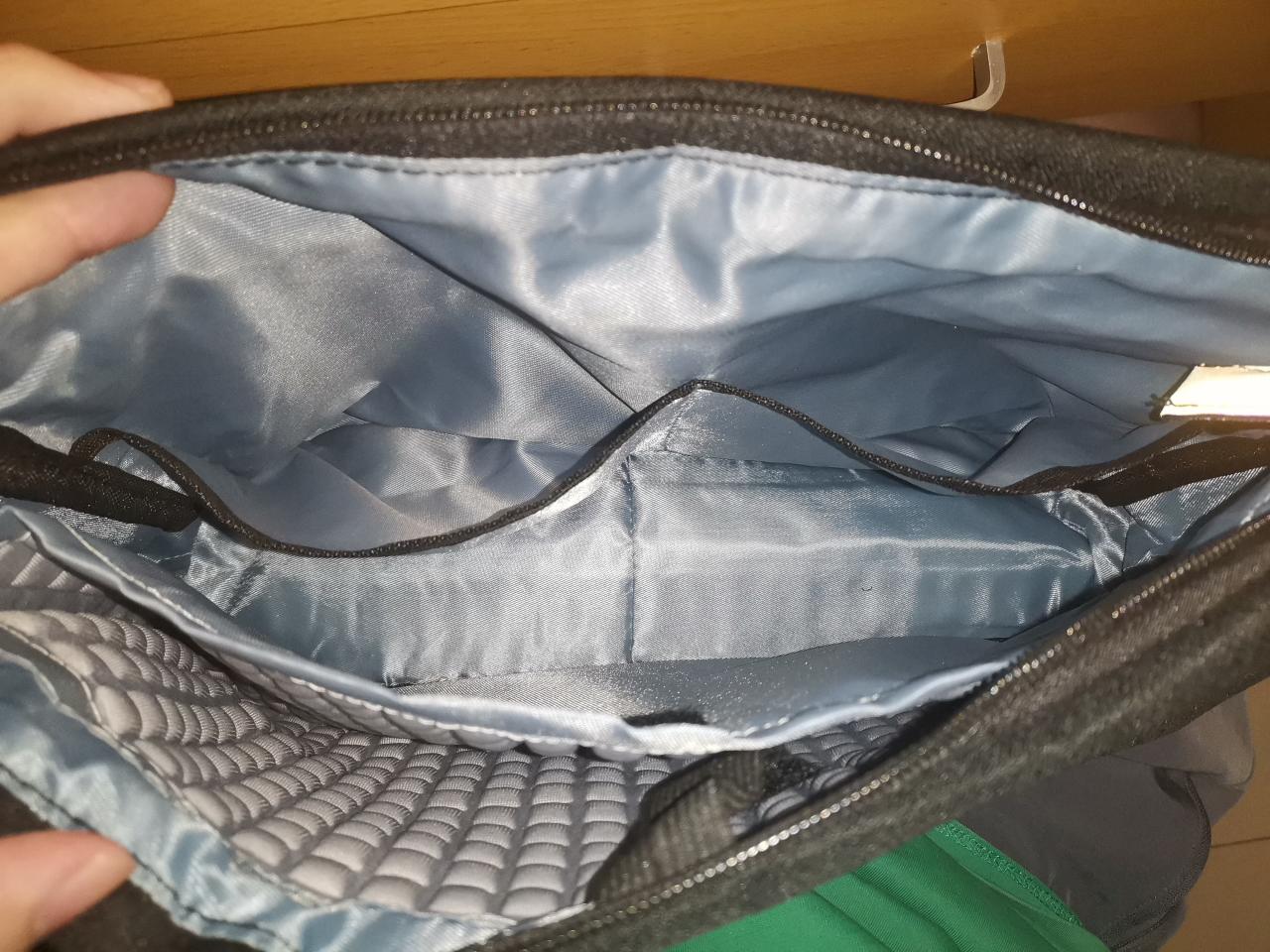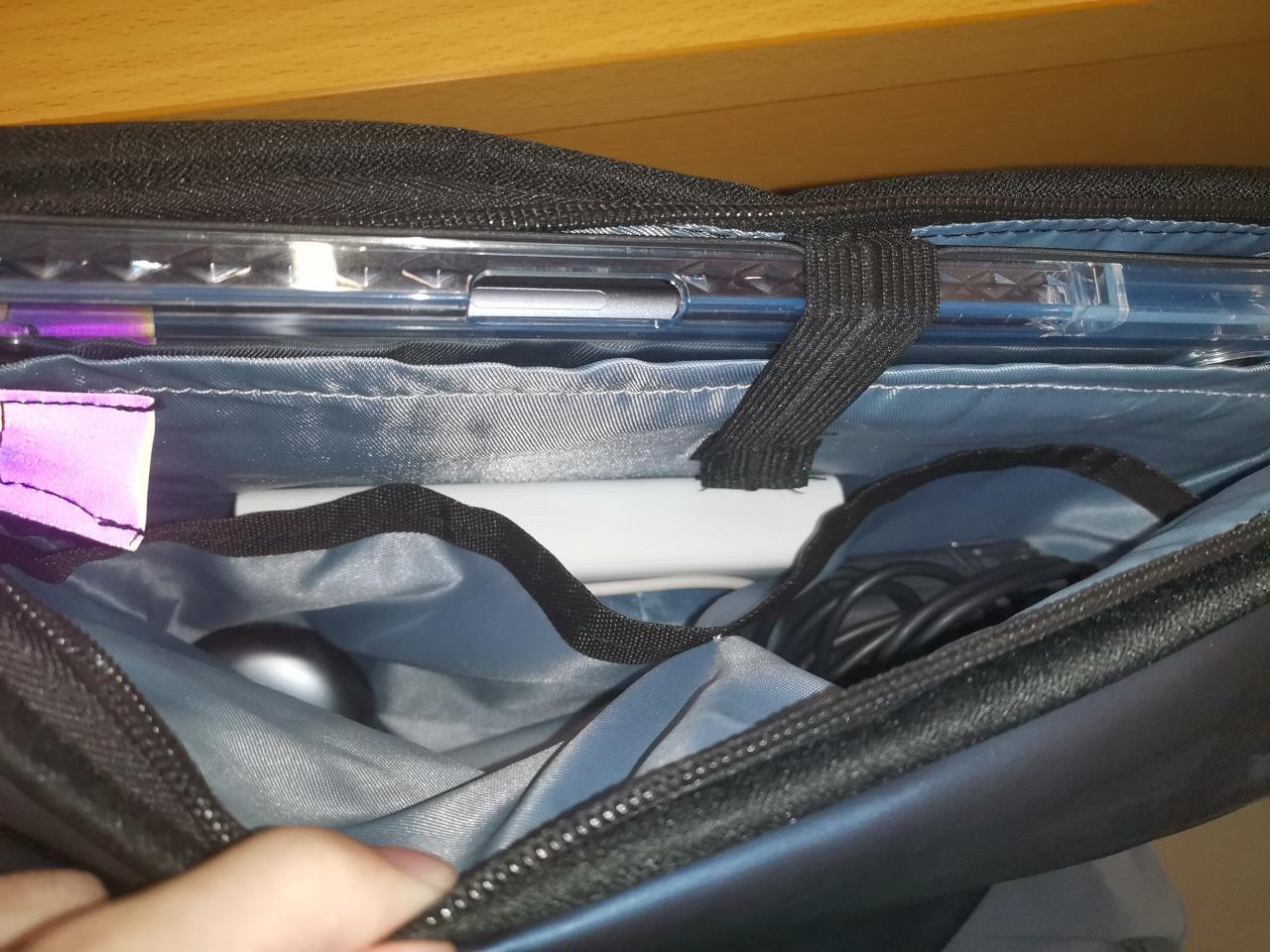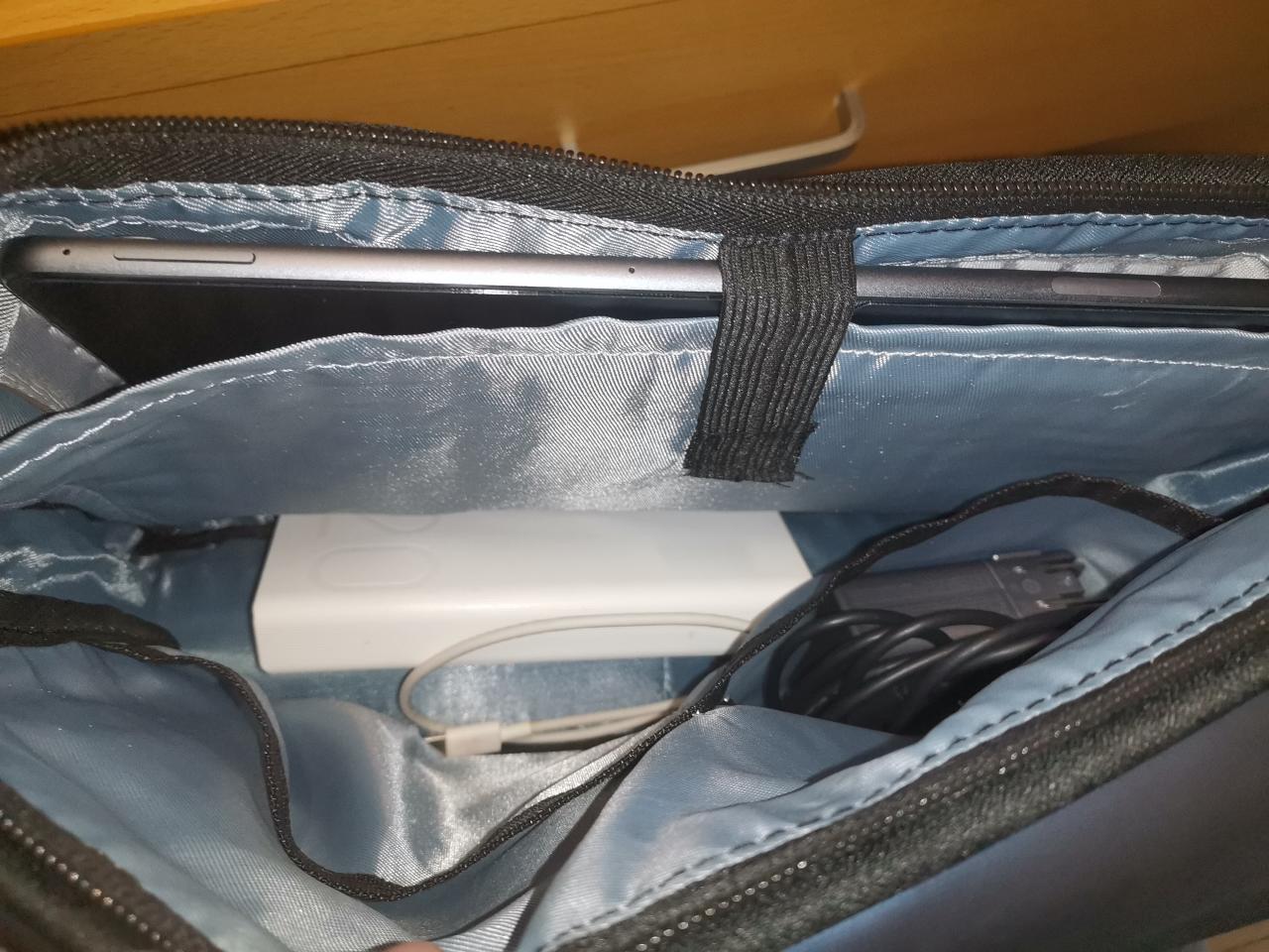 主收纳层除了主要的置物空间,还有两个小口袋和一个带缓冲垫的保护层。其他没什么好说的,着重讲一下这个保护层。保护层的长度刚好可以放进一个不带保护壳的12寸平板,但lz的平板因为有手写笔的收纳槽使得宽度增大,导致这个保护层的深度不足以完整容纳平板,用于固定的带魔术贴的松紧带略短,主收纳层的拉链也是勉强能拉上。不过如果平板是没有保护壳的就能完美容纳。
