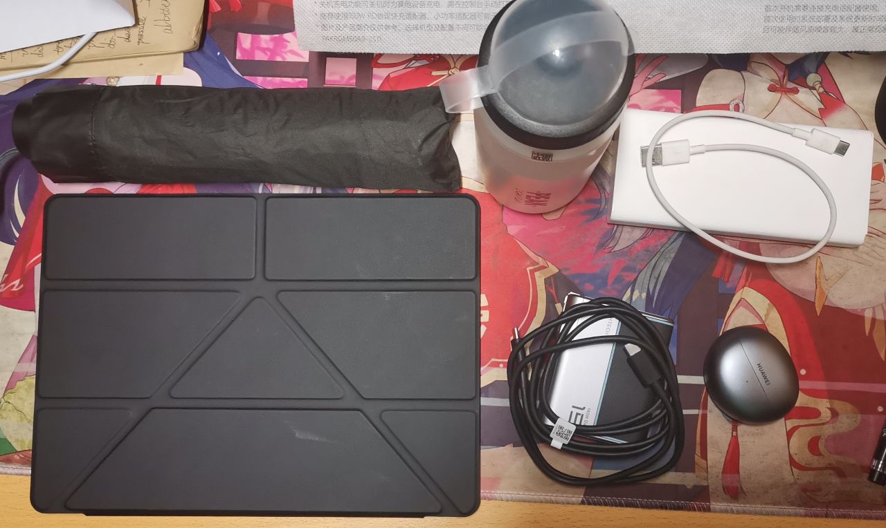 一个12寸的平板,一个酷态科的充电头和长线,一个充电宝和短线,蓝牙耳机,一把折叠伞,一个660ml的水壶