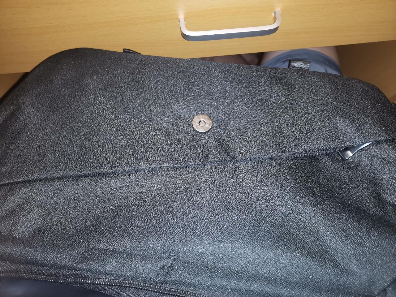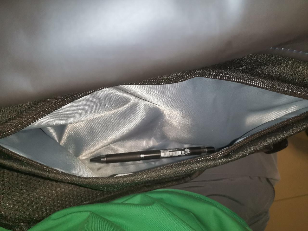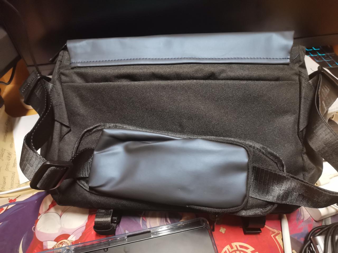 先来看包的外观和做工。包的正面是防水皮料的材质,包身用的是一种摸起来挺粗糙的布料(我叫不出这个布料的名字)。包的做工方面,我翻遍了整个包就找到了两根线头,包的正面皮料用得略多而出现了褶皱,并且有一些细小的划痕,但价格摆在这里,这些也还能接受。