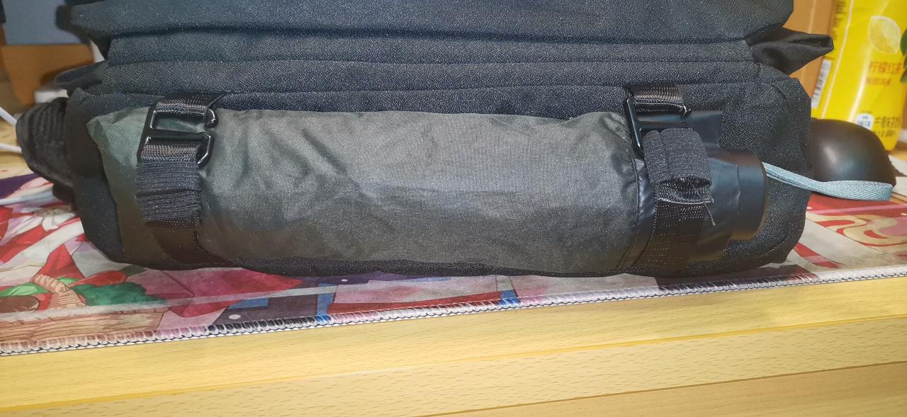 包的底部还有可解开的钩绳,可以把折叠雨伞绑在底部(水杯不行,太粗了)