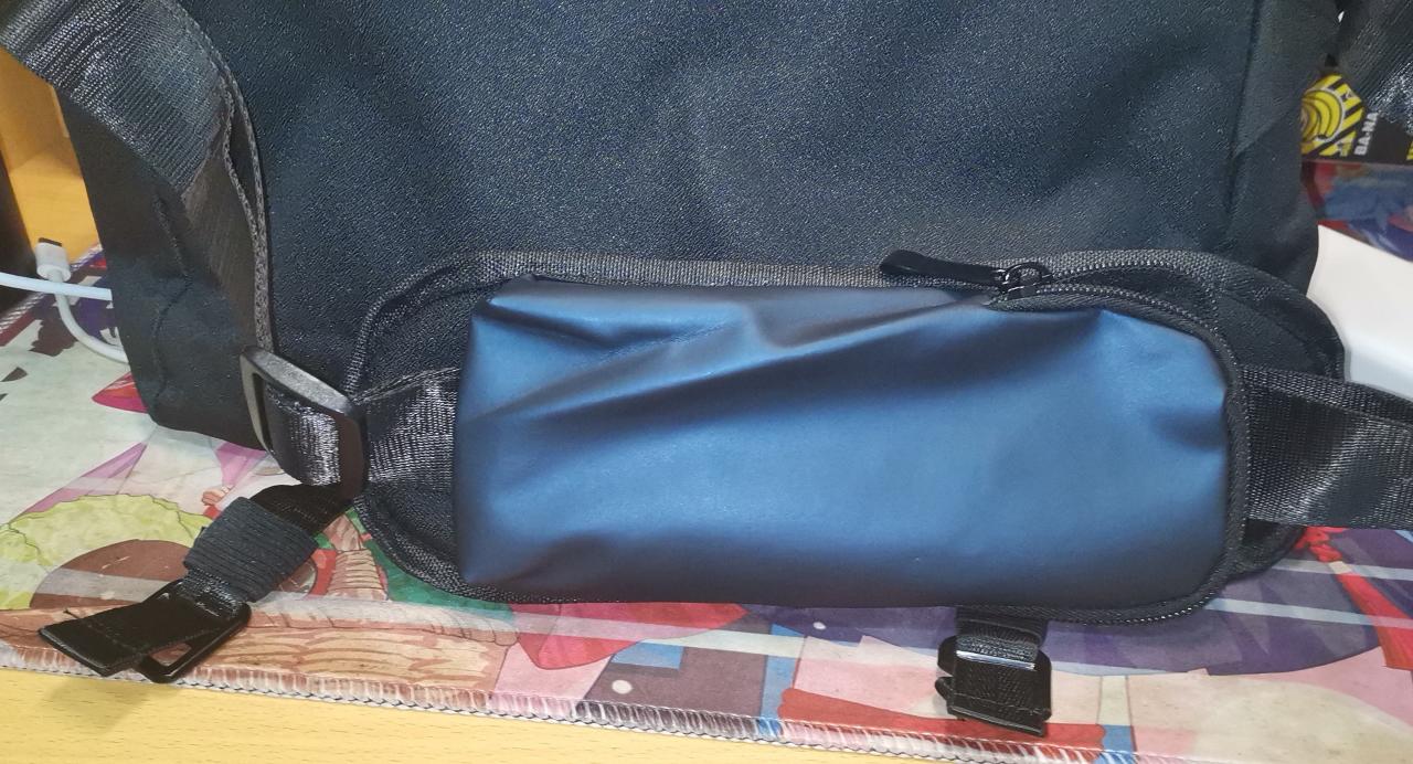 值得一提的是,主收纳层和前置隐藏式收纳层不是一体的,中间分开出一个贯通型置物空间,可以用来放折叠雨伞、水壶等长条物品。该空间的两个开口处有两块布兜住,背起来的时候两个收纳层也会把中间的物品夹住,所以不用担心东西会掉(但还是不推荐放太过细小的物品)。这个置物空间的缺点是放在这里的物品会挤压主收纳层的物品,导致背起来很不舒服,所以建议用这个空间装东西的时候主收纳层不要放太多或太大的东西。