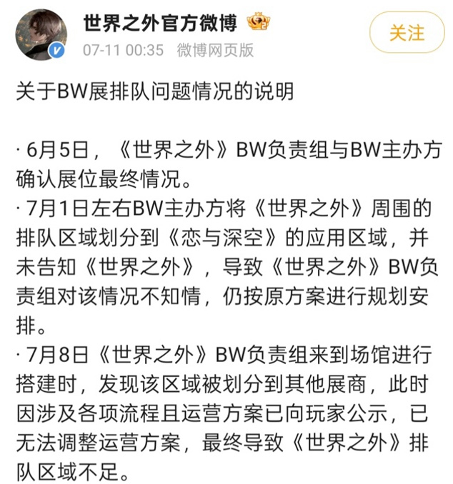 来自参展商的抱怨也不少。你在微博上就能看到《世界之外》公开表明“避雷BW主办方”,不再参加明年的BW,双方甚至深夜对线,还把《恋与深空》的参展项目组也卷了进来。