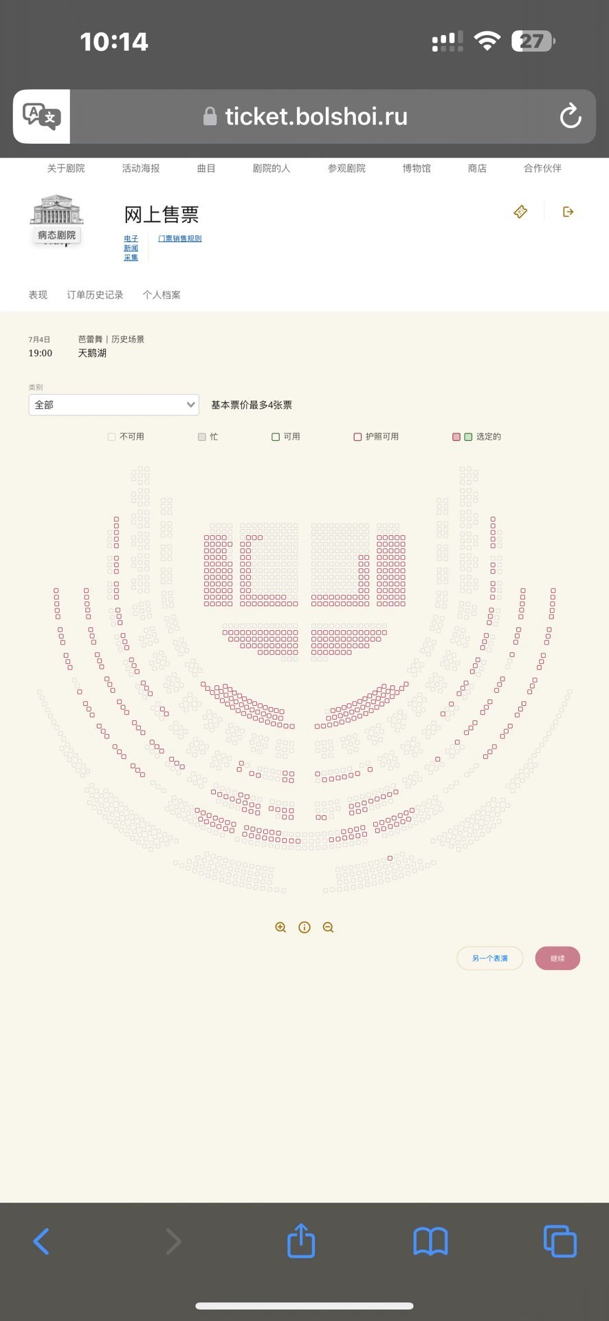 6月4日看7月4日的天鹅湖余票,注意红框才是空位,我选的就是最下边的那个红框