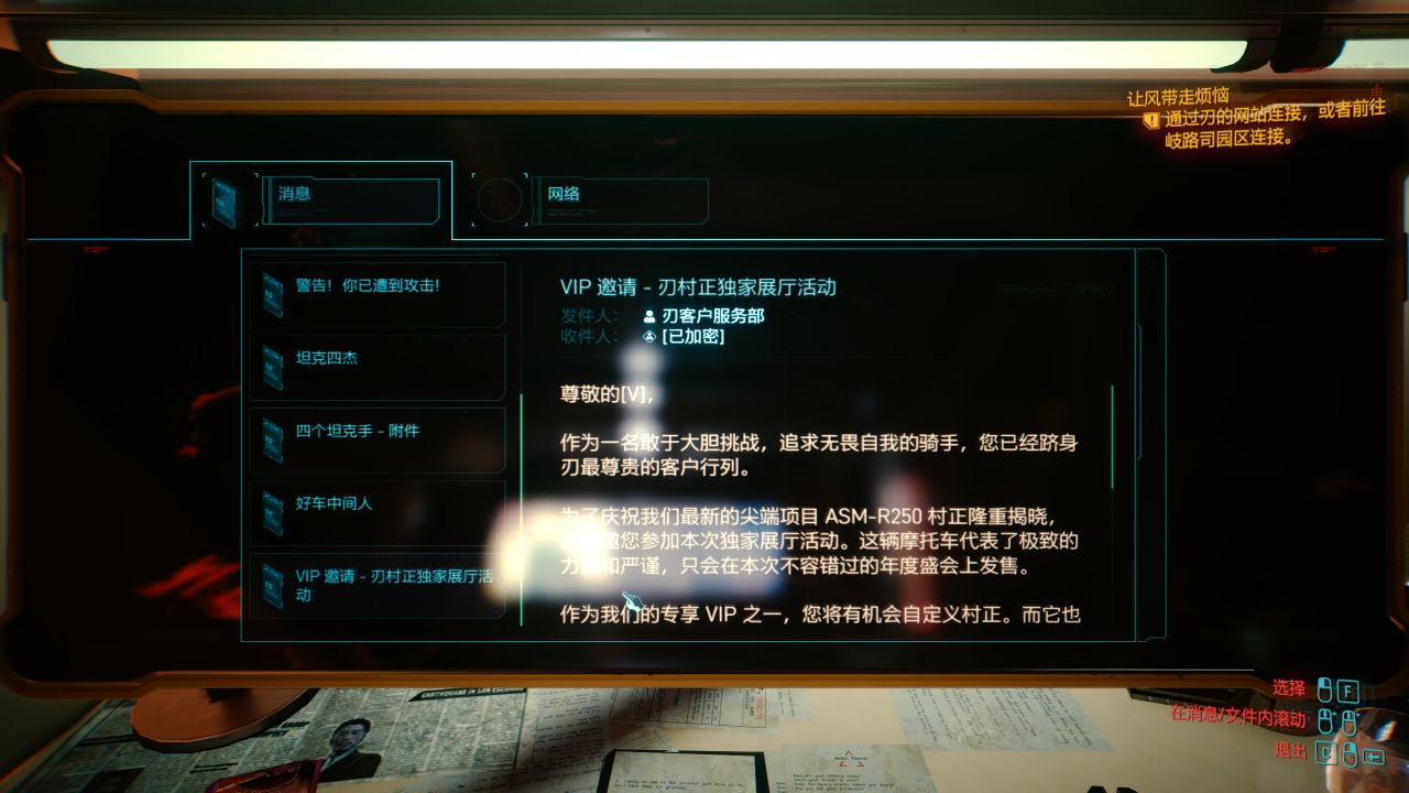 完成後等待數日,回到公寓並且打開電腦。信息裏會有一條新消息,讀取後點擊隔壁網絡,找到刃展廳,接入即可,按照任務流程走可以訂購。