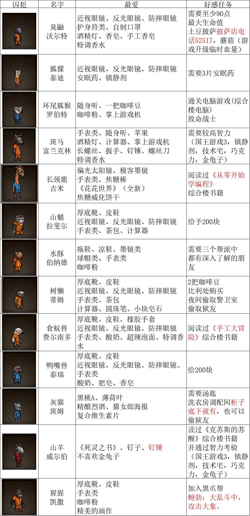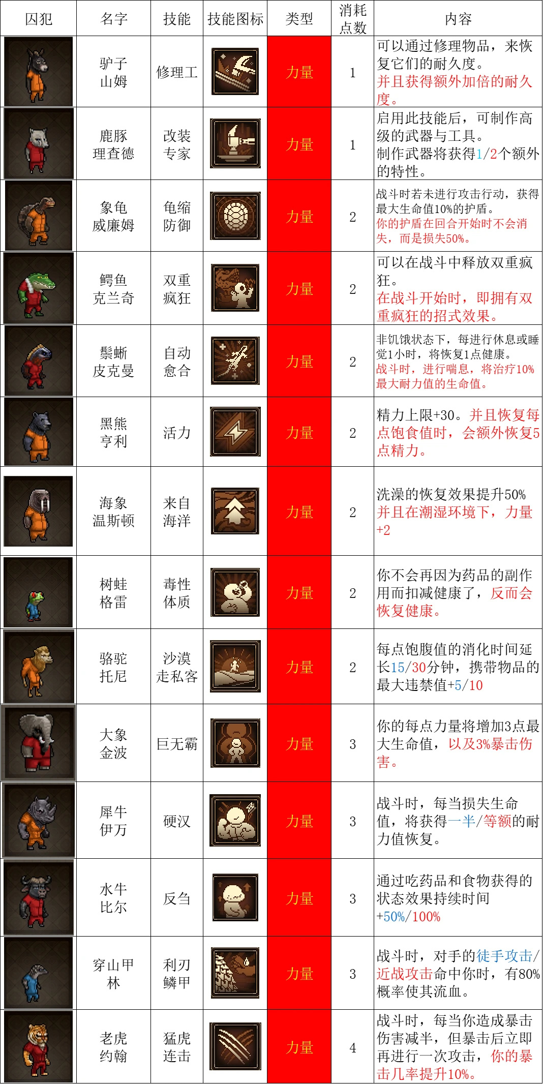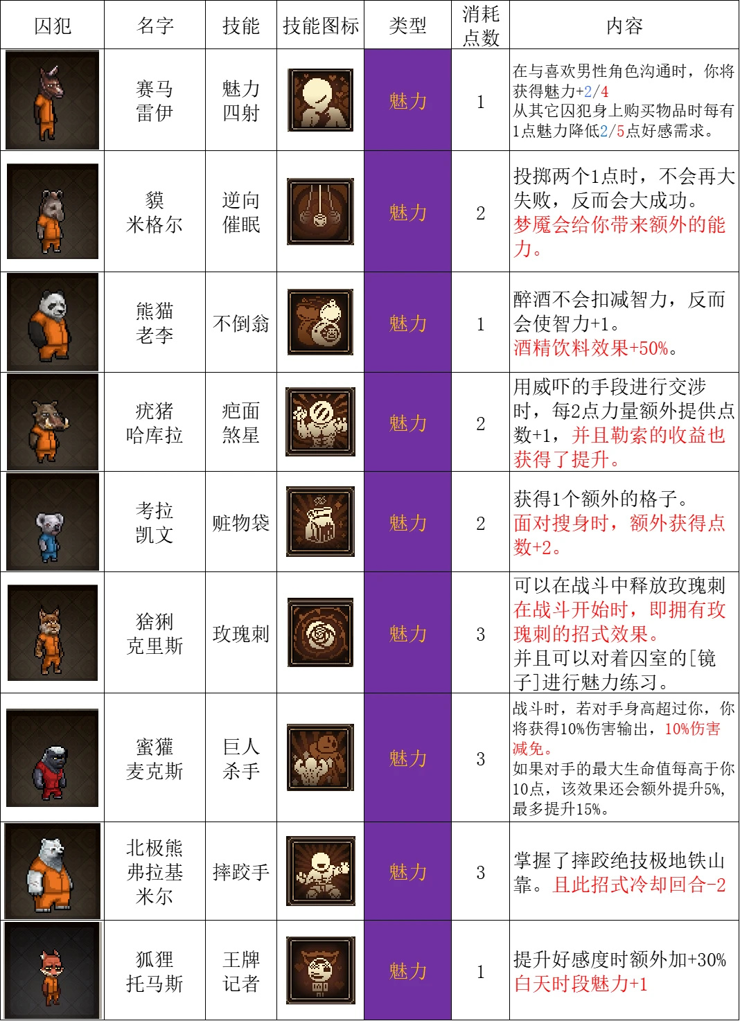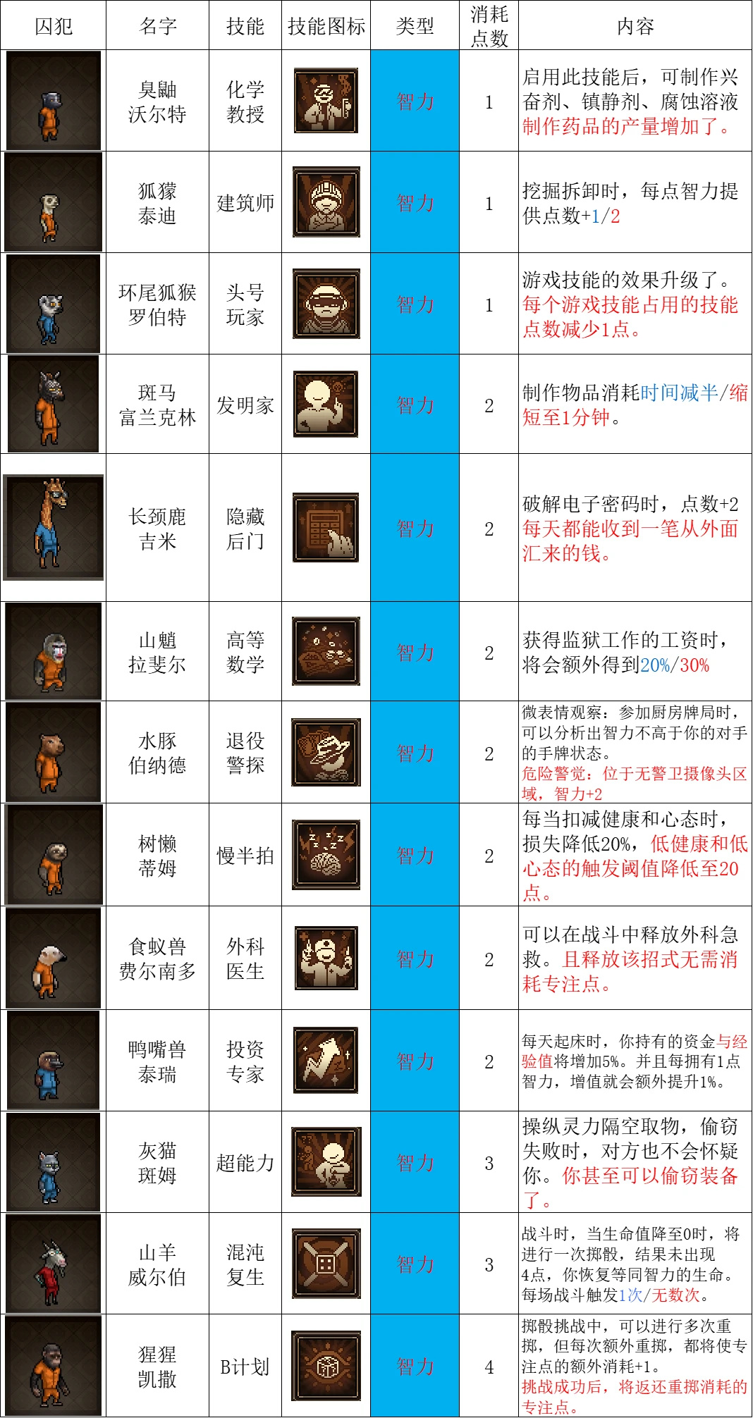 智力,在战斗时可提升暴击几率,在制定策略,阅读书籍,学习特殊技能,智力越高进度越快。在学习狐獴的建筑师后,挖掘、开凿、腌黄瓜等一系列越狱打工能力,其进度也将附带2倍的智力数值加成。