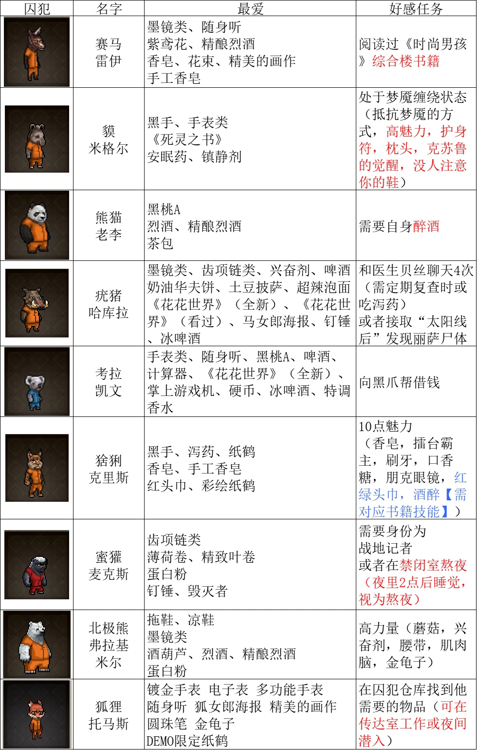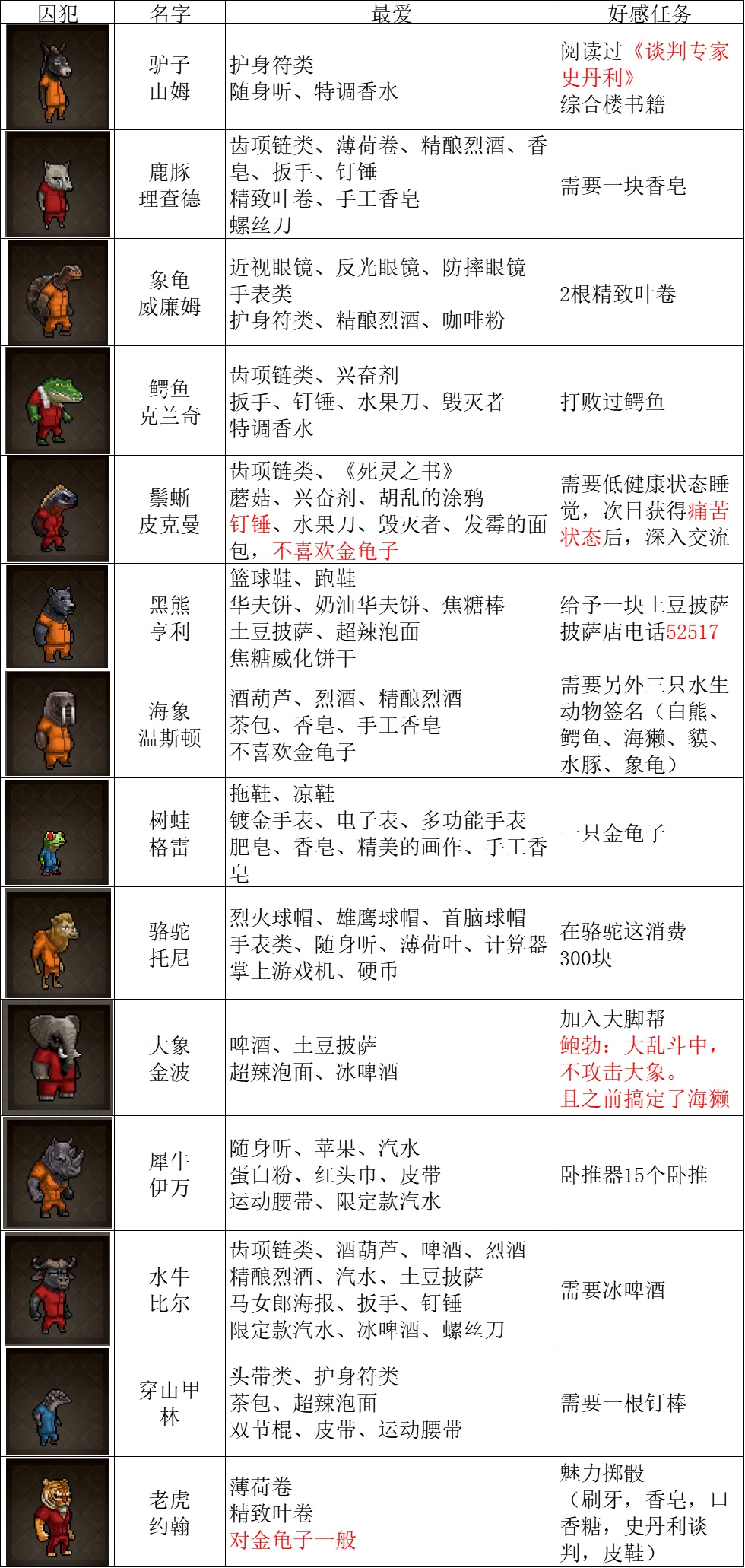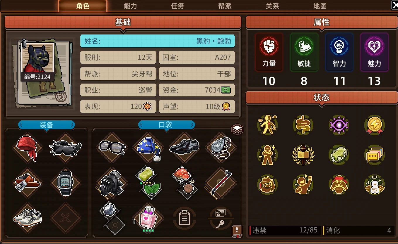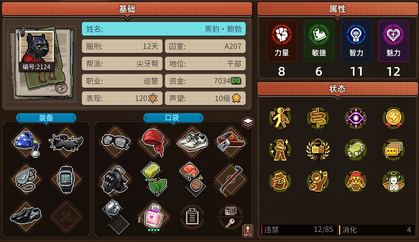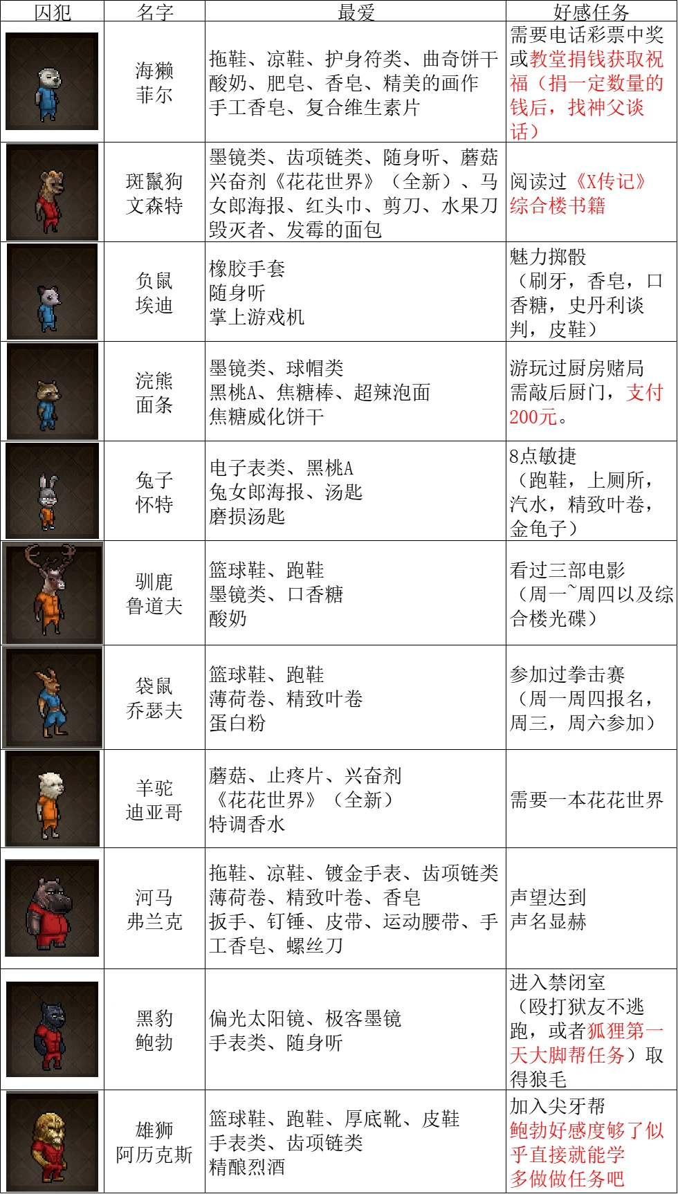 智力,在战斗时可提升暴击几率,在制定策略,阅读书籍,学习特殊技能,智力越高进度越快。在学习狐獴的建筑师后,挖掘、开凿、腌黄瓜等一系列越狱打工能力,其进度也将附带2倍的智力数值加成。