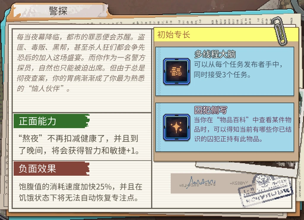 警探职业,是狐狸视角下,鲍勃的默认职业。多线程大脑,和囚犯侧写技能,前期相当好用(不过规划好了,有没有差不多,对于新手来说非常友好)。