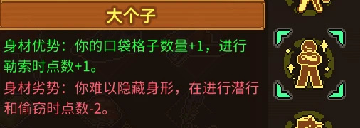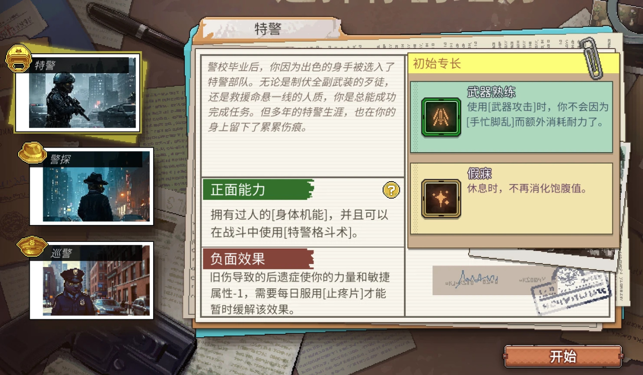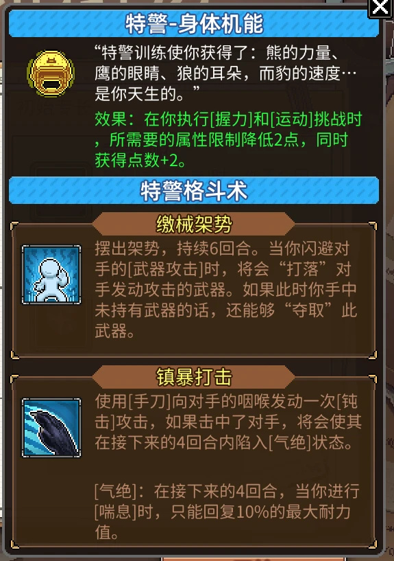 特警的负面效果十分致命,力量、敏捷属性-1,需要止痛片(永久-2最大生命值,如果开启树蛙“毒性体质”技能,副作用会失效)才能维持1天恢复效果,意味着他对止痛片的要求较高。平时盗窃能力进一步下降(战斗力倒是没啥,毕竟4点基础力量也不低了)。