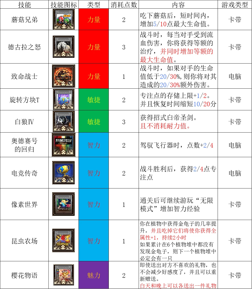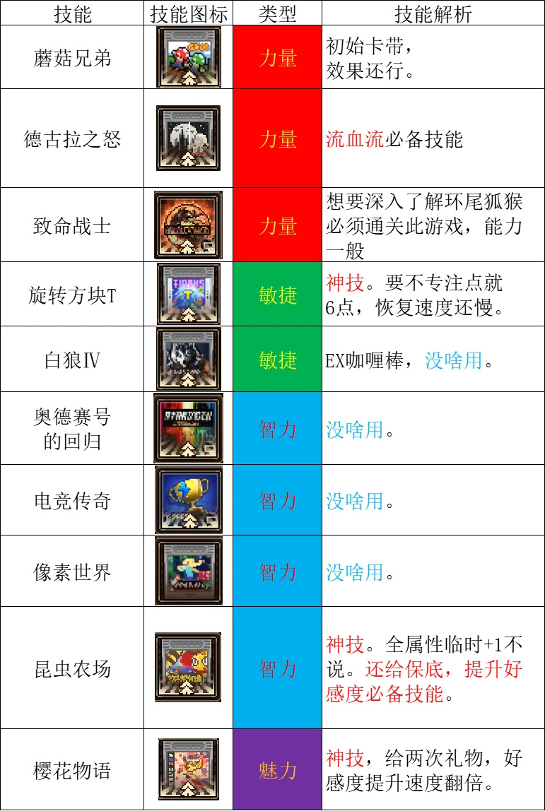 游戏技能(需搭配环尾狐猴的深入了解技能食用,红字为环尾狐猴技能获得后获得的效果。而环尾狐猴技能升级后,所有游戏类技能消耗点数-1,已学习的技能,会返还技能点):