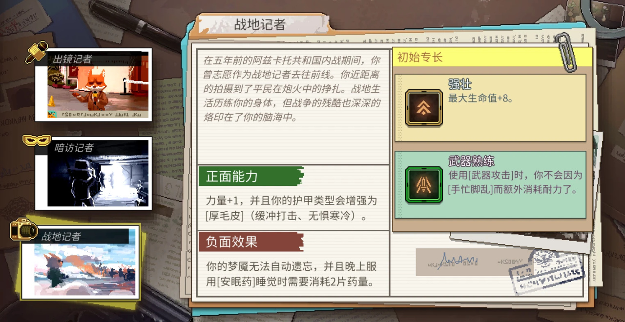 战地记者,自带力量+1的猛男。4点初始力量,意味着搭配腰带(+2力量),精气神,蘑菇(+1力量),就可能尽早获得大力出奇迹。搭配几次力量挑战,获得肌肉脑,可以常驻7点初始力量(配合腰带9点)。高力量可以提供高基础伤害与耐力上限。