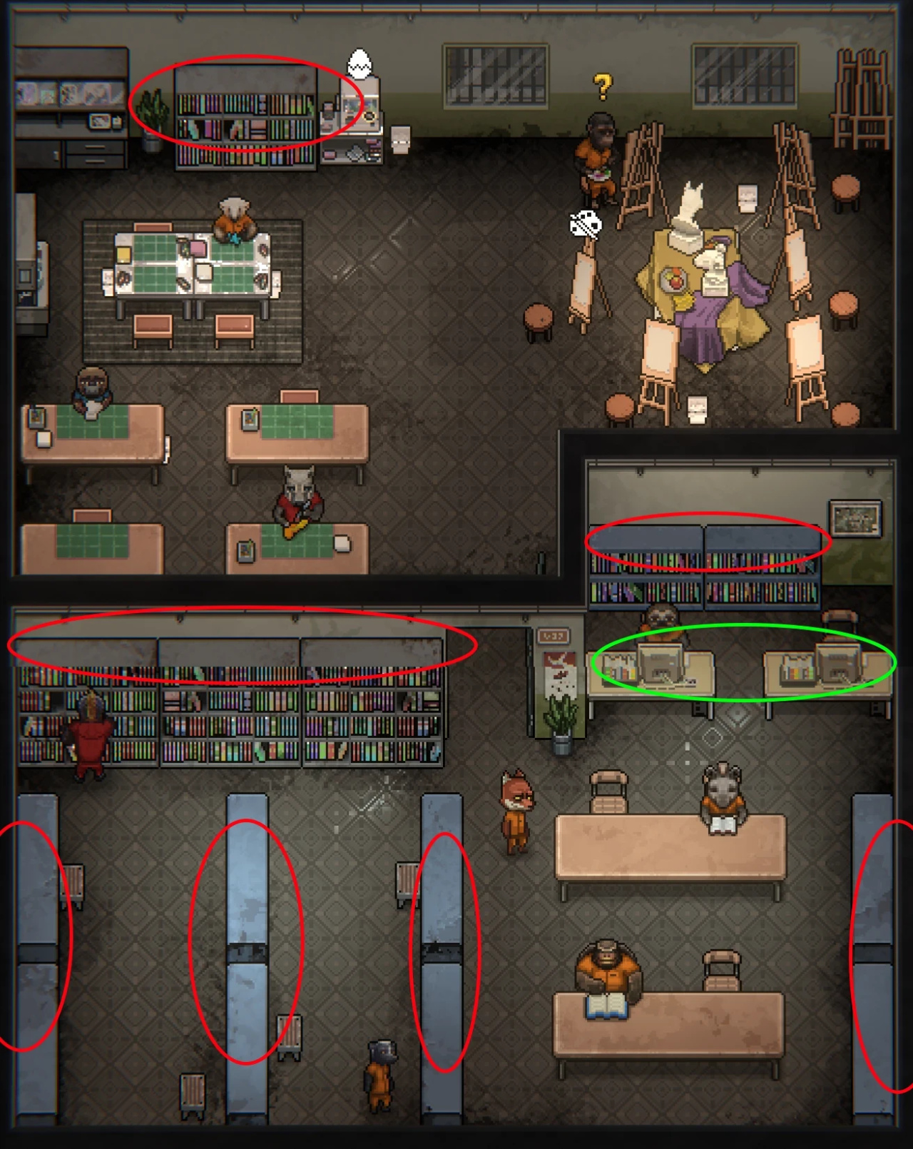 红圈处有书籍,绿圈处可播放藏经阁电影,或游玩专属的电脑游戏,或阅读新神父的电子书(也吃近视眼镜加成)。阅读书籍可提升智力经验,想要加快进度,最好搭配“近视眼镜”(监狱二楼,白天黑爪帮柜子撬锁获取)。书虫和四舍五入也是阅读书籍的必备技能。