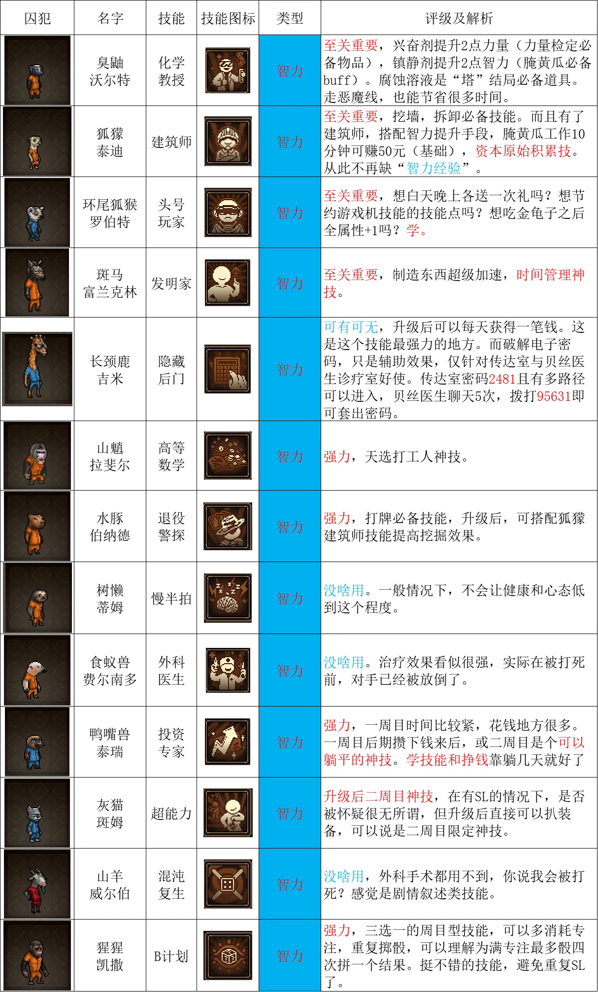 暗访记者自带的两个初始基础技能,没啥用。工匠看似不错,但依靠固定点位摸工具,就能找到比自制更强的工具了。时间点上,也不影响脱狱。