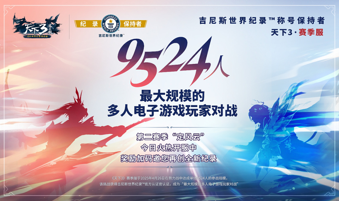 但令圈內人喫驚的是,刷新這項記錄的並非是什麼新硎初試的爆款黑馬作品,而是上線已有17年之久的《天下3》:在該作4月26日S1賽季“定山河”勢力戰中,這遊戲單場戰鬥的參戰人數達到了恐怖的9524人。