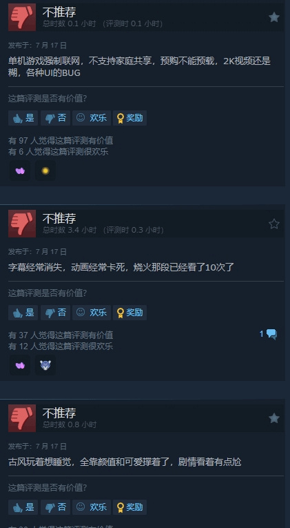 但是也有玩家指出,本作作为单机游戏强制联网,不支持家庭共享,还存在字幕消失,动画卡死等多处BUG,仍需开发团队完善。