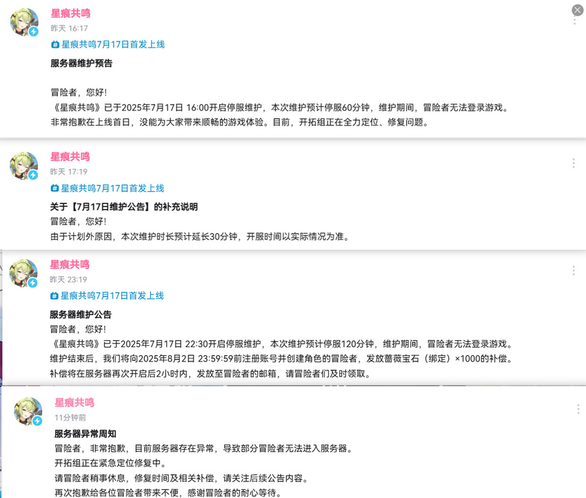 7月17日8:00,承载着全网超1000万预约量的《星痕共鸣》正式开服。然而仅半小时后,玩家遭遇大规模卡顿掉线,服务器彻底崩溃。