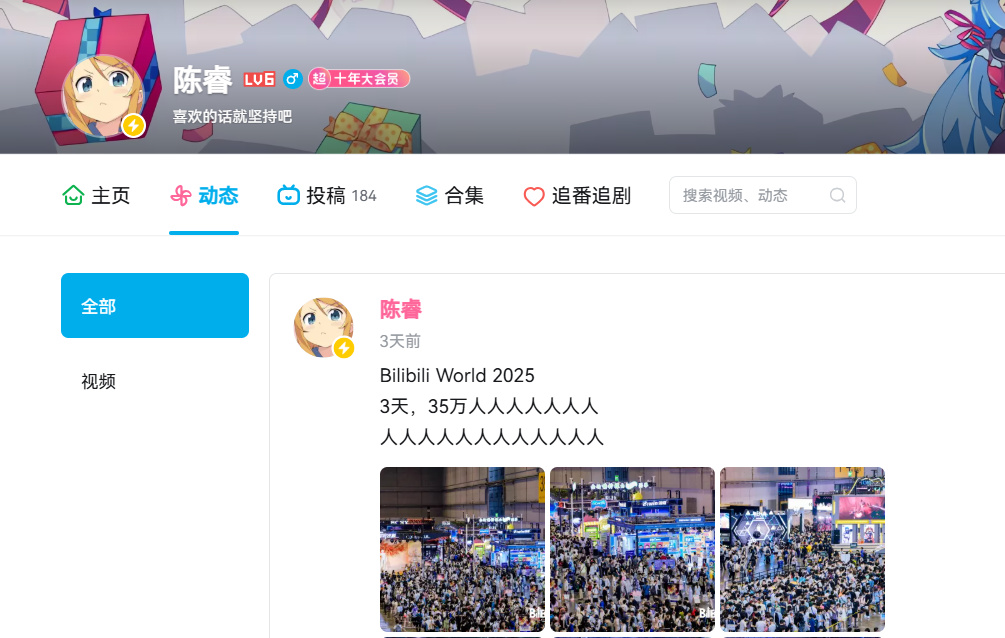 并且他被拍摄到的这天,叔叔后来也在B站的个人账号上发了Vlog,没有任何修饰,真就是随手一拍,随手一发,属于典型的二次元们去Live记录下,发个朋友圈证明自己来了,俗称“赛博留痕”