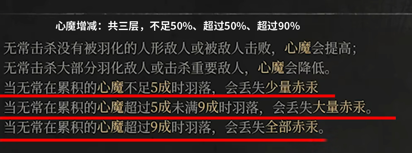 死亡次数或击杀过多人形敌人会积累心魔值,满值后生成心魔分身(玩家镜像)。击败分身可获得额外赤汞(魂,方便打字下面统一称魂),但分身会使用玩家未解锁的技能,且属性大幅强化。