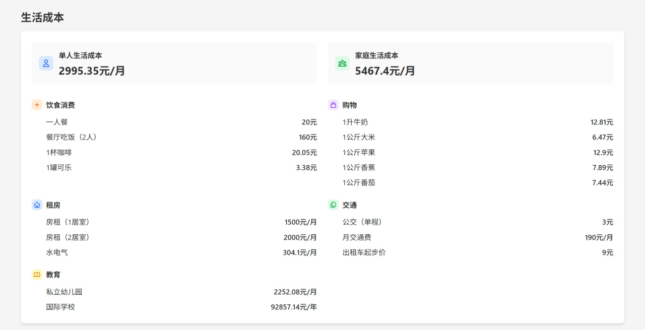 生活成本方面,单人每月 2995.35 元就能生存,家庭(三口之家)每月 5467.4 元能应对。