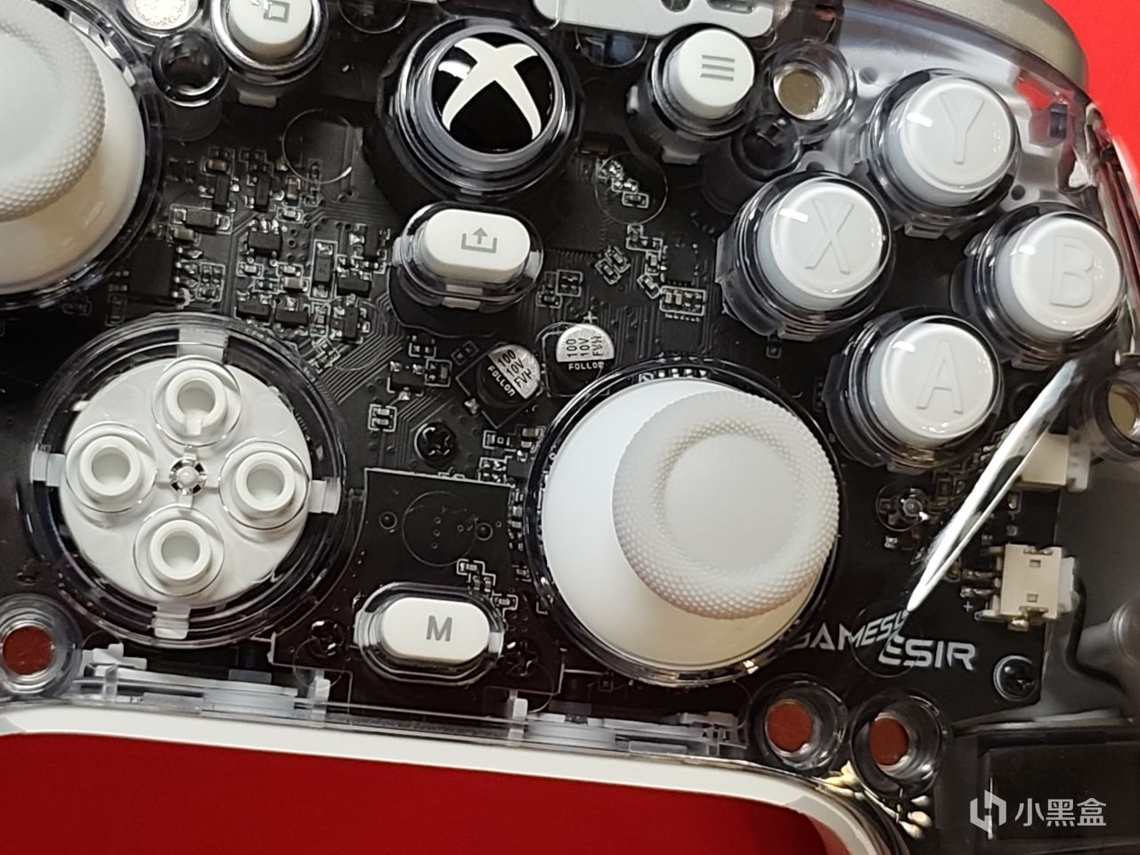 面壳拆卸之后透过一层透明塑料就可以看到内部的电路板,和小鸡之前的影舞者系列有着异曲同工,对喜欢手柄透明化设计的盒友们来说绝对是一个福音。