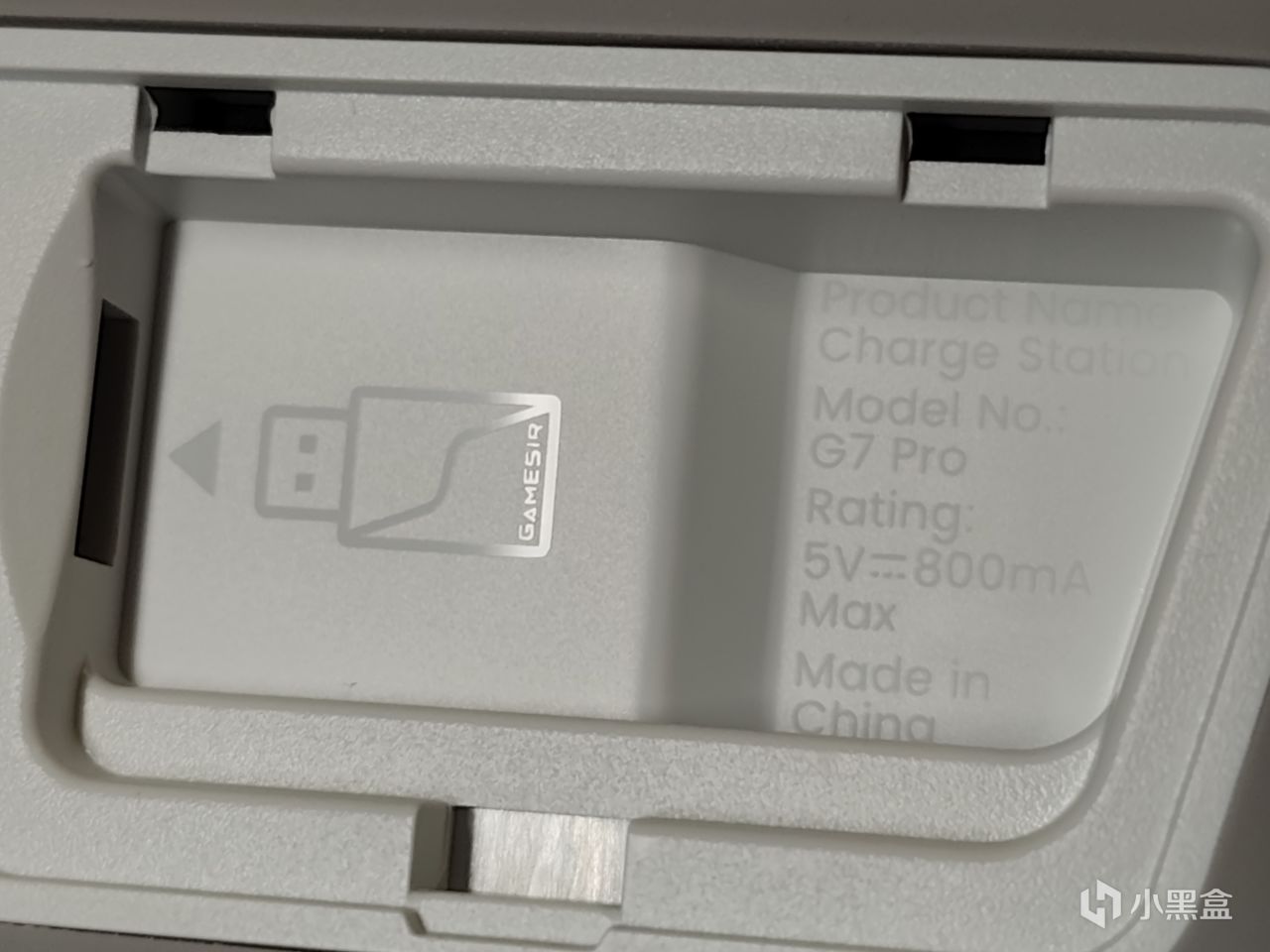 手柄的握把处使用了包胶材质,在防滑性和手感上有所提升。正中间的按钮主要用于手柄在蓝牙和2.4G模式中切换,而下方的四个触点口可以搭配底座做到无线充电。顺带一提,这次的G7pro电池容量大约在1200mah左右,即使不充电的情况下也能连续使用1~2周。