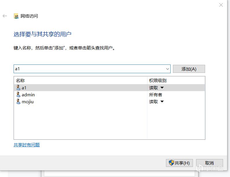 5.右鍵需要共享的文件夾->【屬性】->打開【共享】->選擇剛剛創建的用戶【a1】,添加->最後點擊【共享】