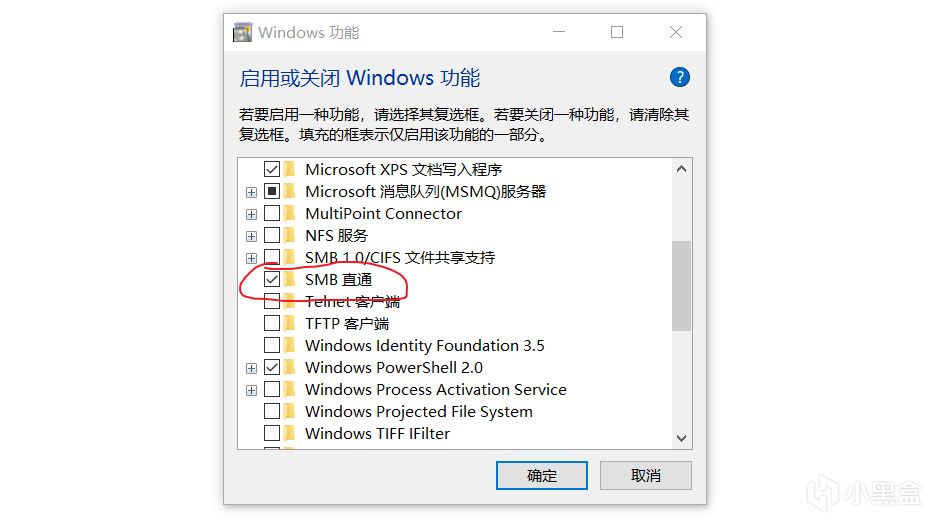 2.將【SMB直通】的勾給勾上(注意:這個功能可能家庭版沒有,專業版纔有。若是沒有這個功能,自行搜索,應該是有解決方法的)