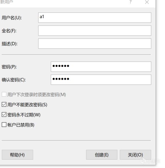 (無密碼保護,可跳過)創建一個專門用來共享的賬戶和密碼,右鍵window圖標或者搜索框搜索【計算機管理】->打開【本地用戶和組】,打開【用戶】->右鍵【新用戶】->輸入用戶名和密碼->勾上【用戶不能更改密碼】和【密碼永不過期】->【創建】。