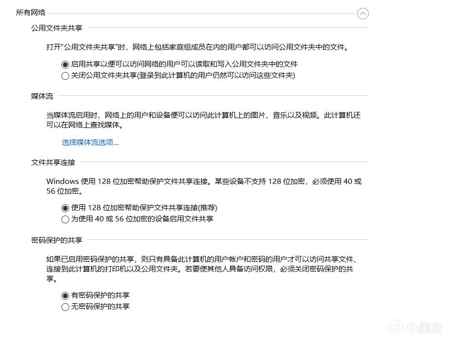 【所有網絡】->【公用文件夾共享】->【啓用共享】;【密碼保護的共享】->勾上【有密碼保護的共享】(注意:選擇有密碼保護,就需要賬戶和密碼才能正常使用)